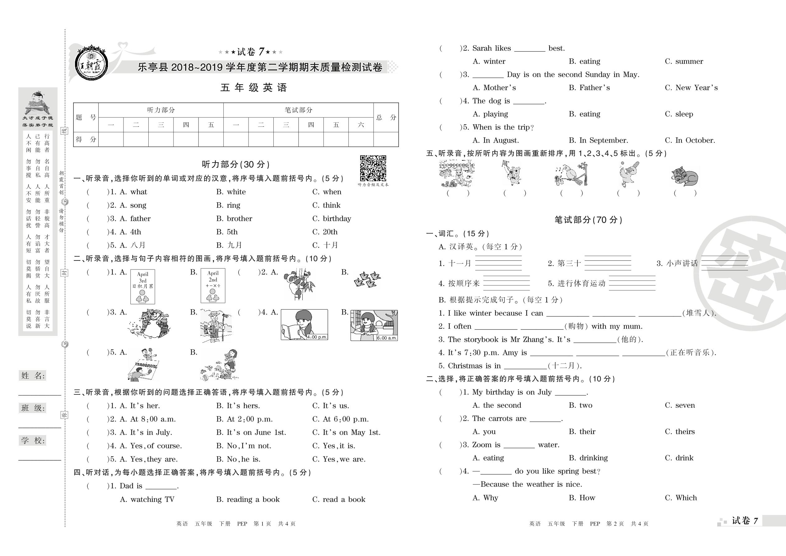 2018-2019学年第二学期唐山市乐亭县五年级英语试卷(PEP版)【7】