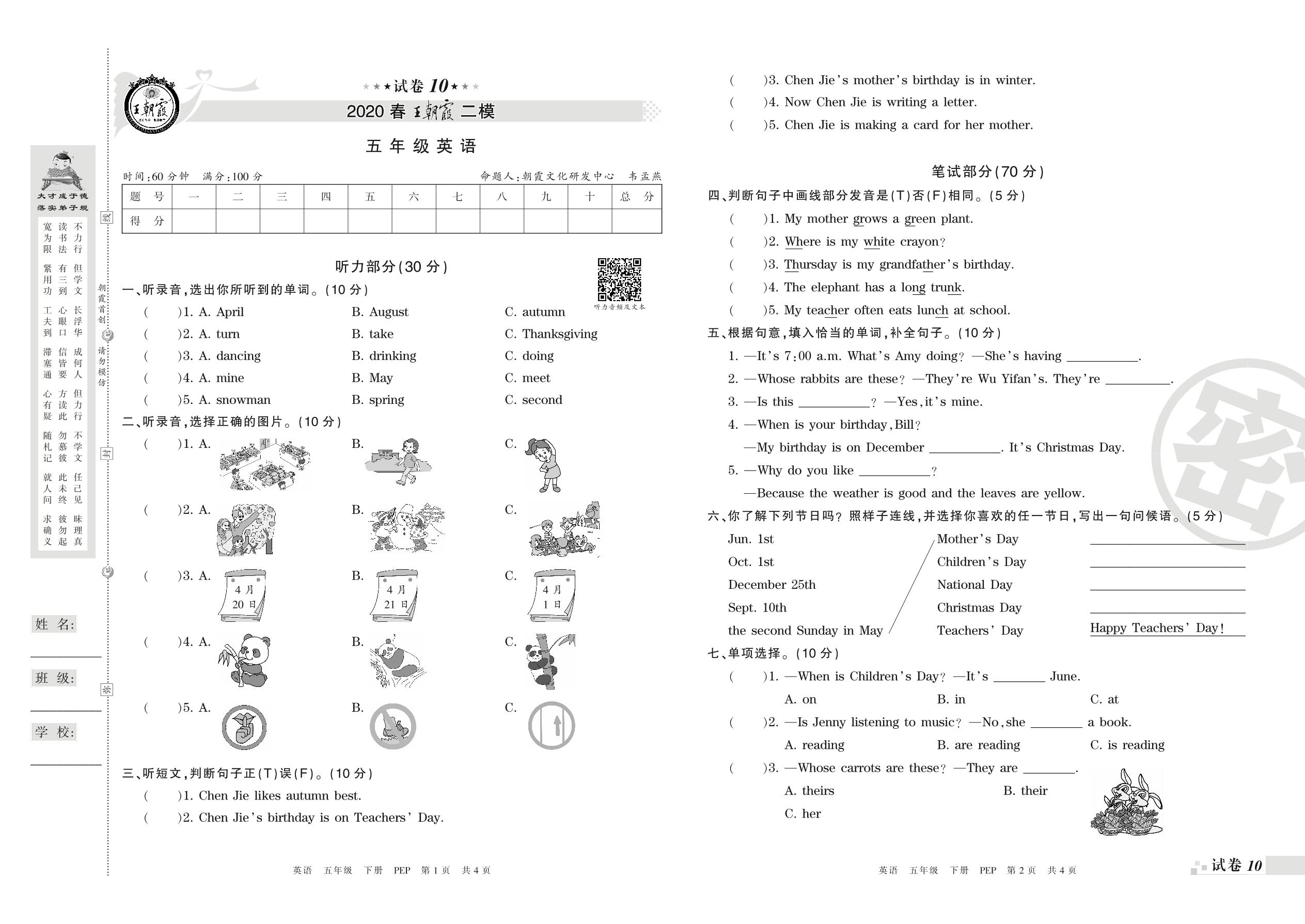 王朝霞期末模拟卷五年级下册英语(PEP版)_R210807142347【10】