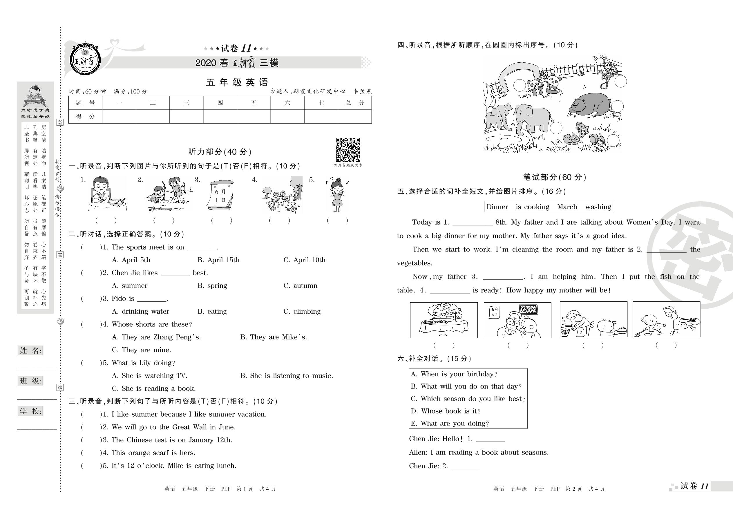 王朝霞期末模拟卷五年级下册英语(PEP版)_R210807142352【11】