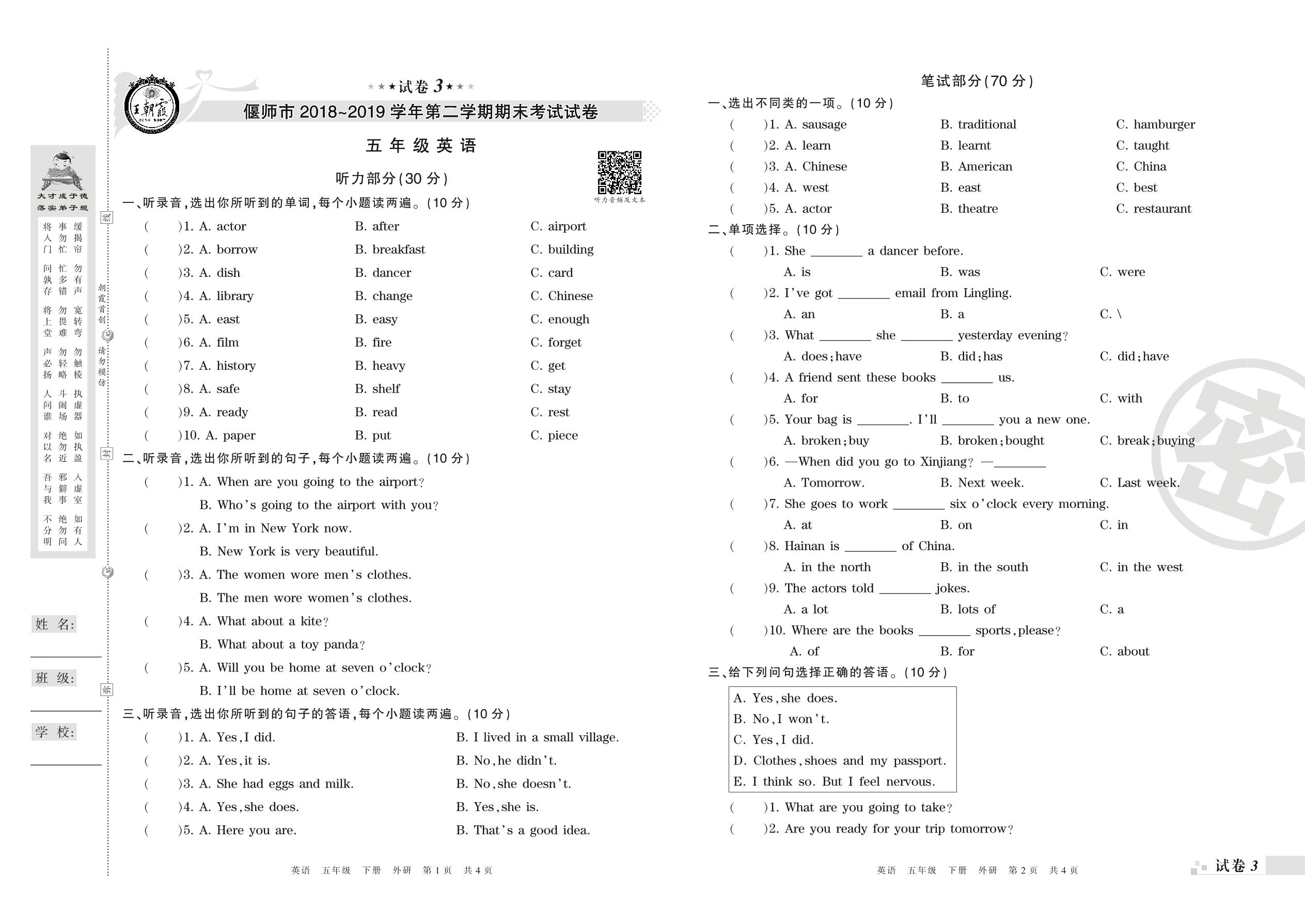 2018-2019学年第二学期偃师市五年级英语试卷(外研版)【3】