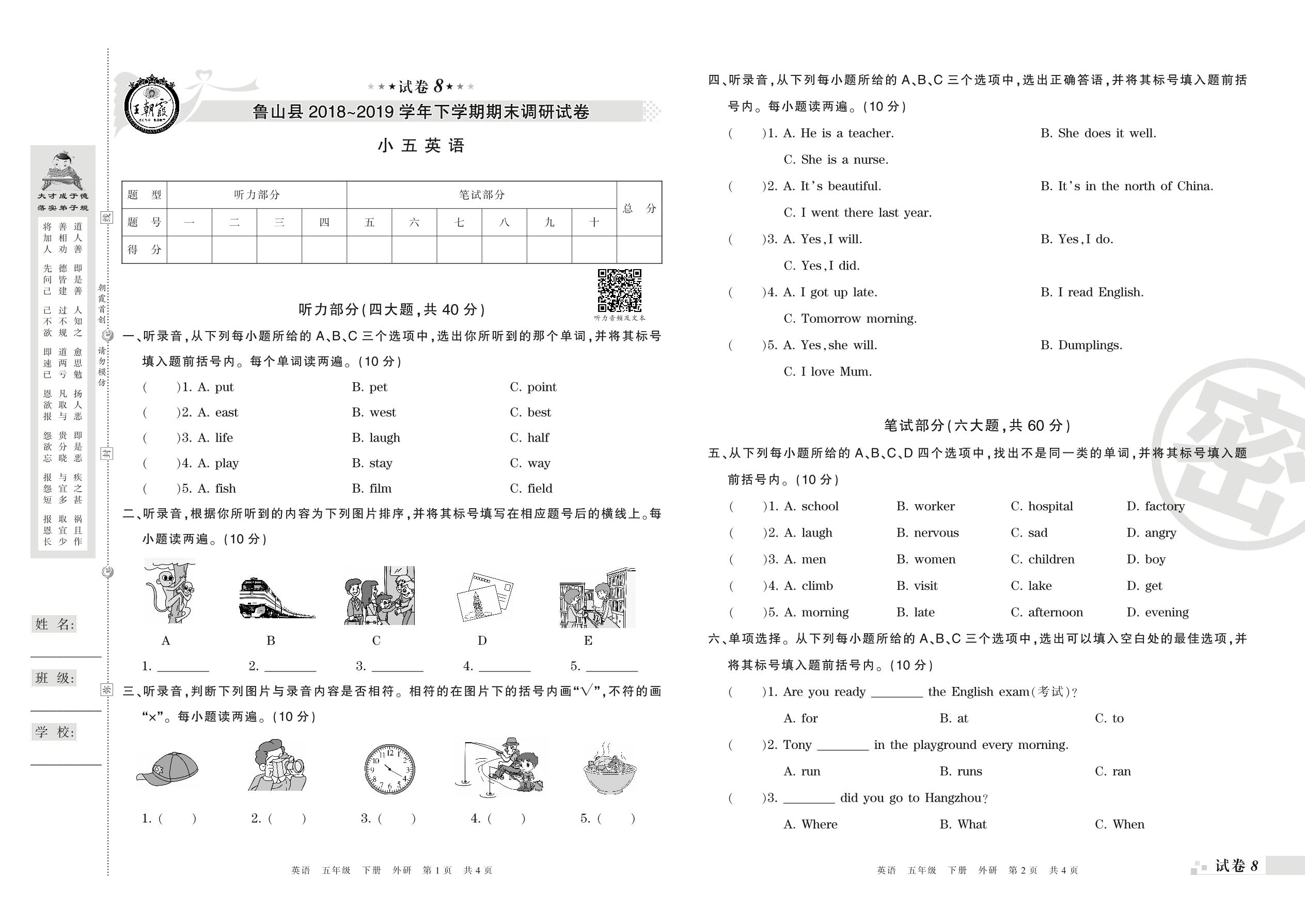 2018-2019学年第二学期平顶山市鲁山县五年级英语试卷(外研版)【8】