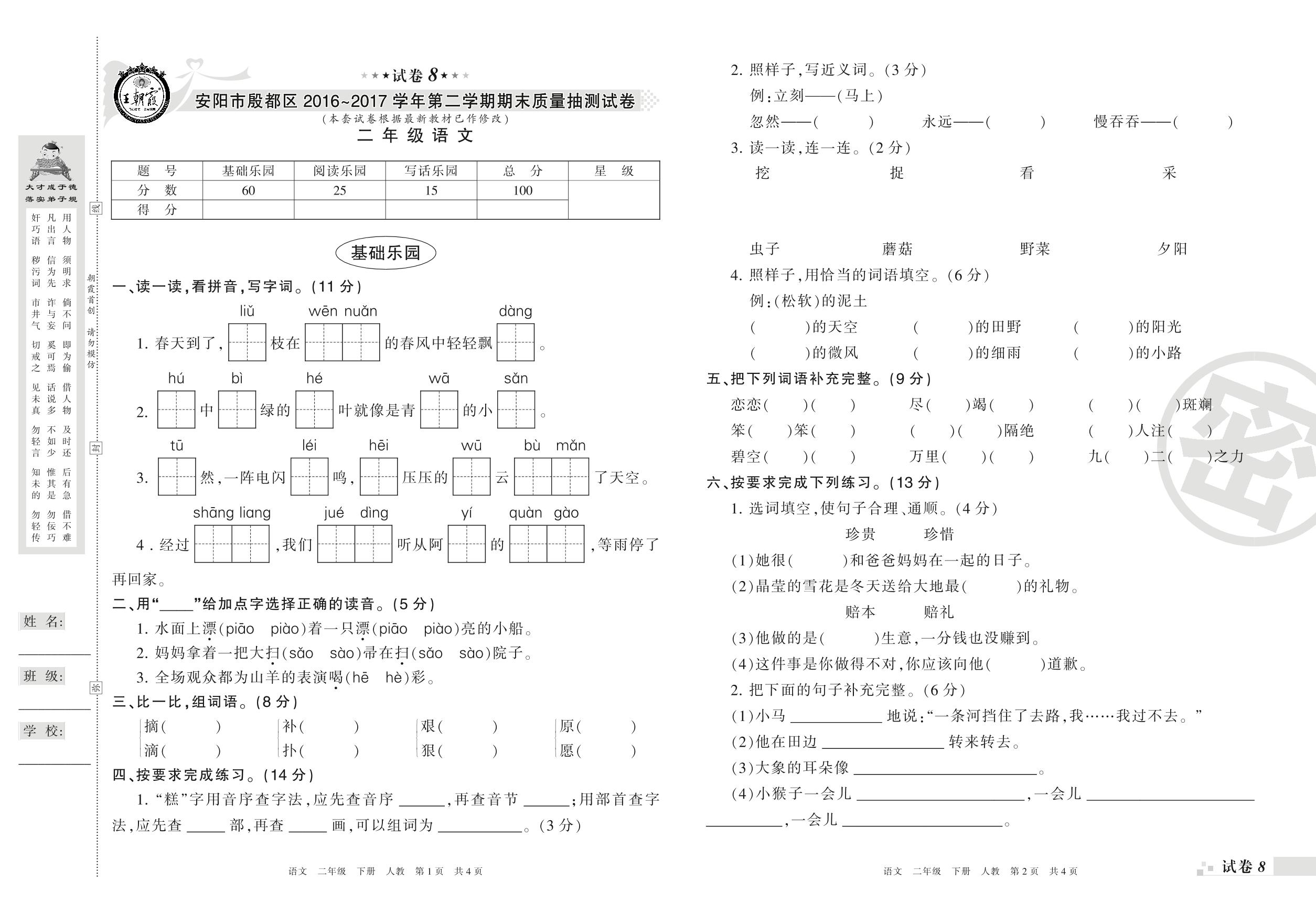2016-2017学年第二学期安阳市殷都区二年级语文试卷(人教版)【8】