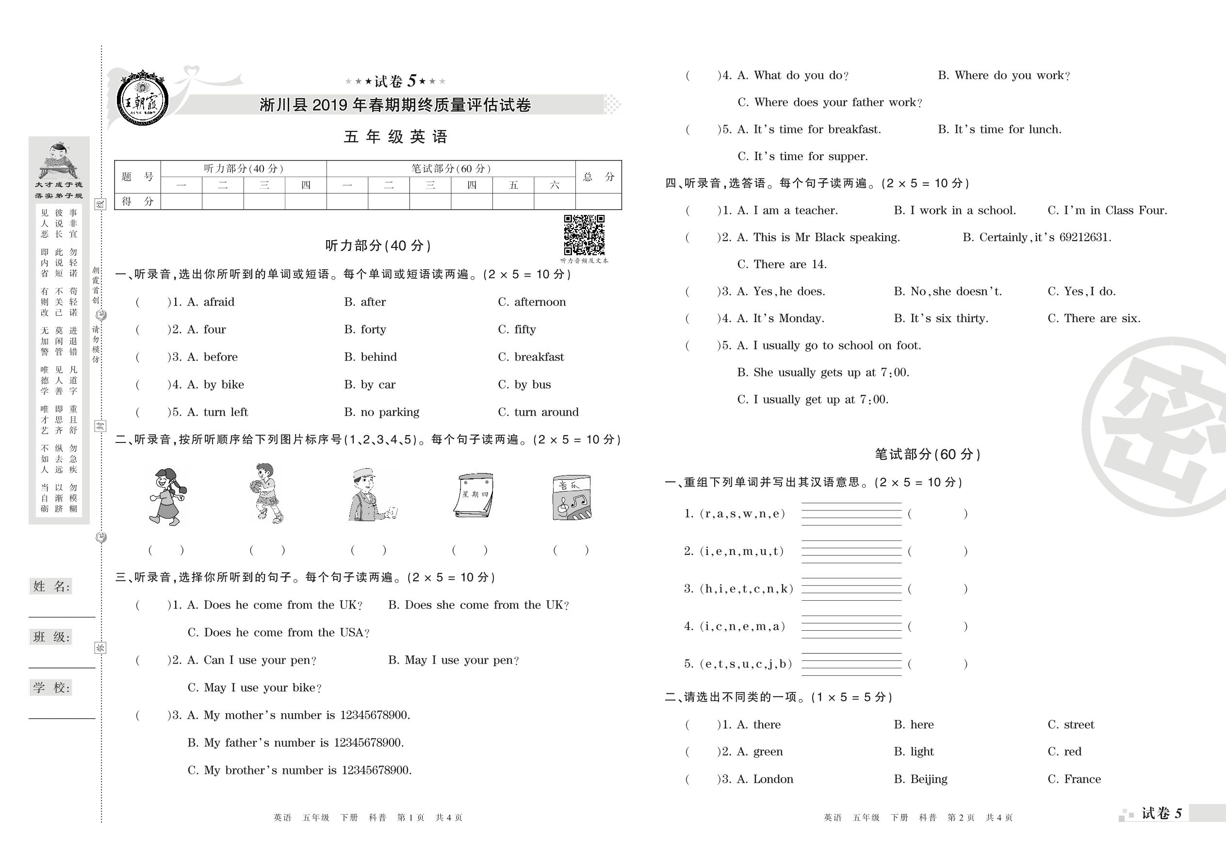 2018-2019学年第二学期南阳市淅川县五年级英语试卷(科普版)【5】