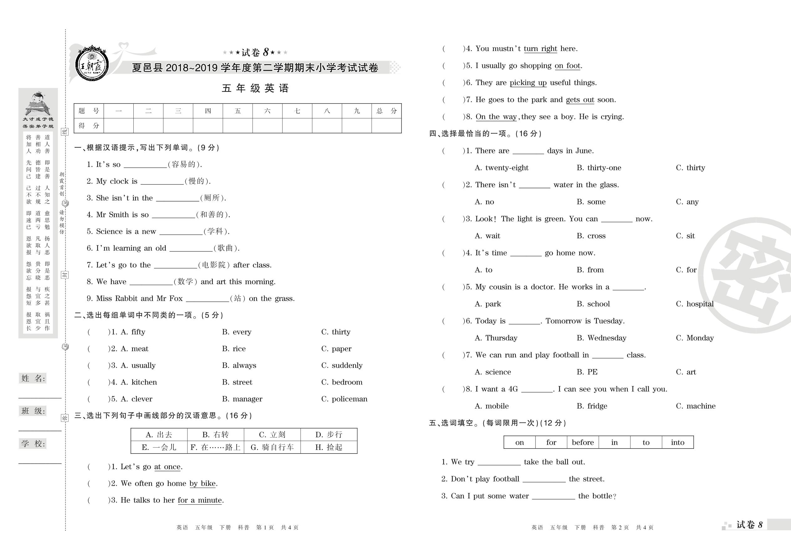 2018-2019学年第二学期商丘市夏邑县五年级英语试卷(科普版)【8】