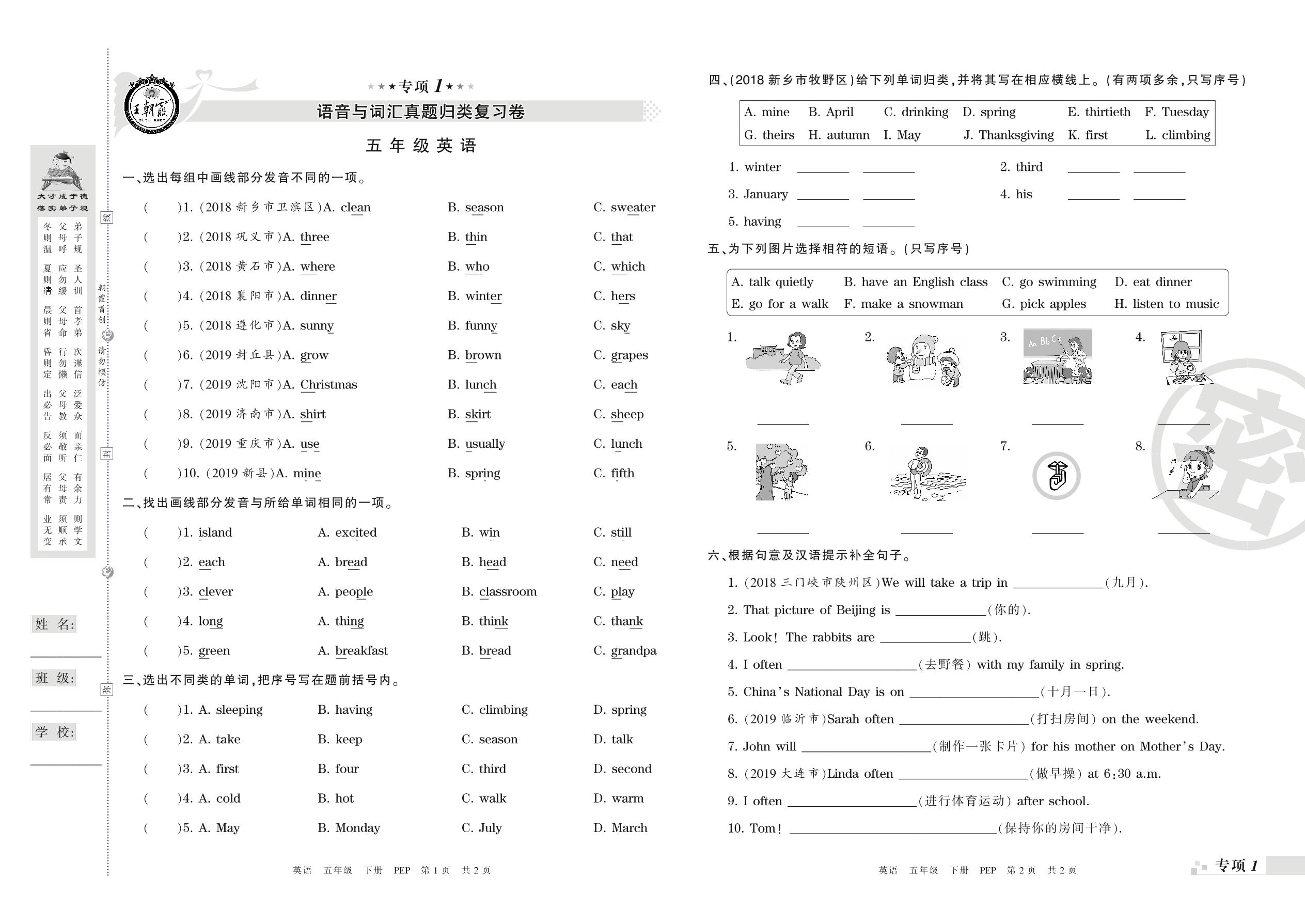 王朝霞期末专项卷——语音与词汇、句子(一)真题归类复习卷五年级下册英语(PEP版)_R210807142624【0】