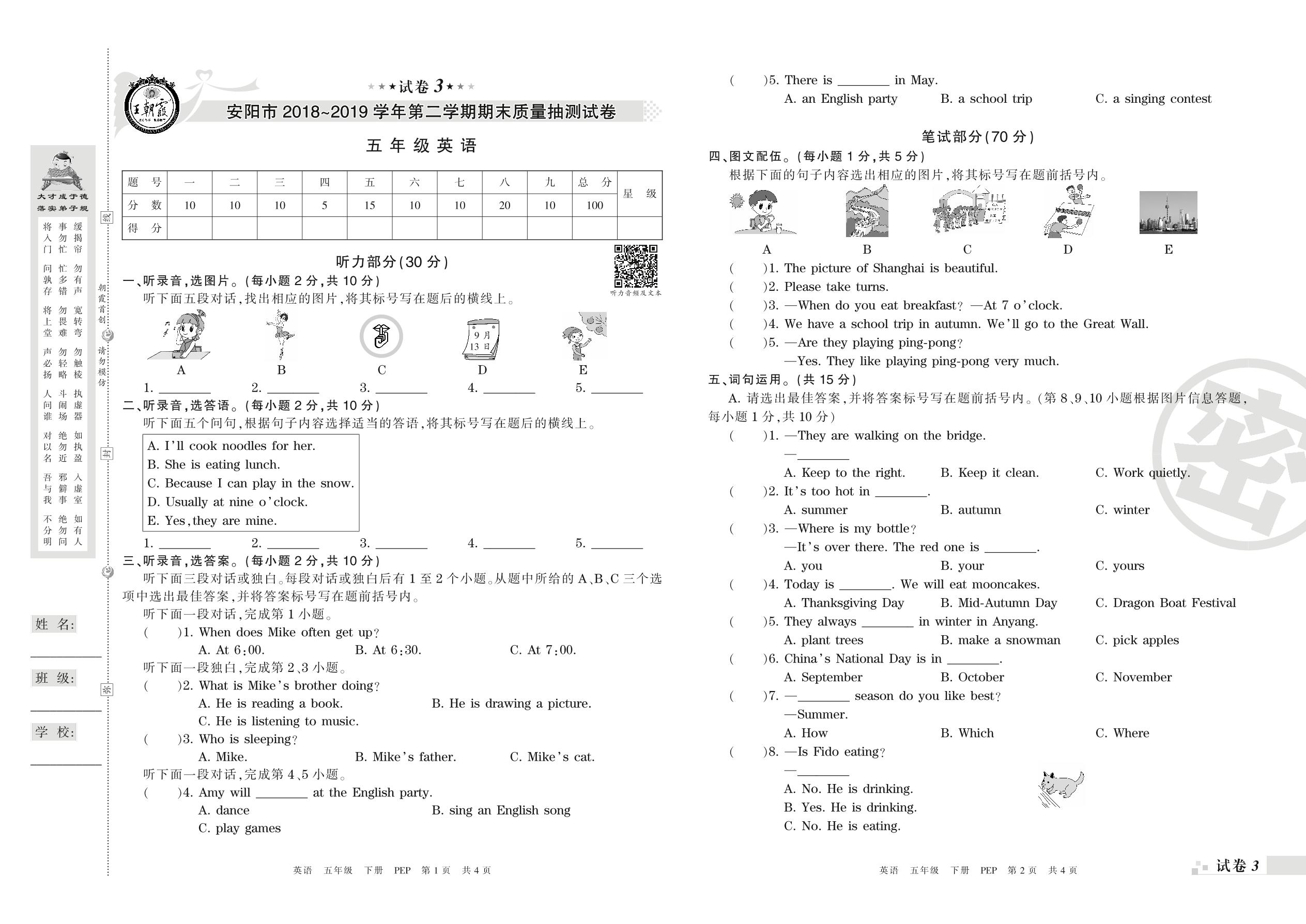 2018-2019学年第二学期安阳市五年级英语试卷(PEP版)【3】