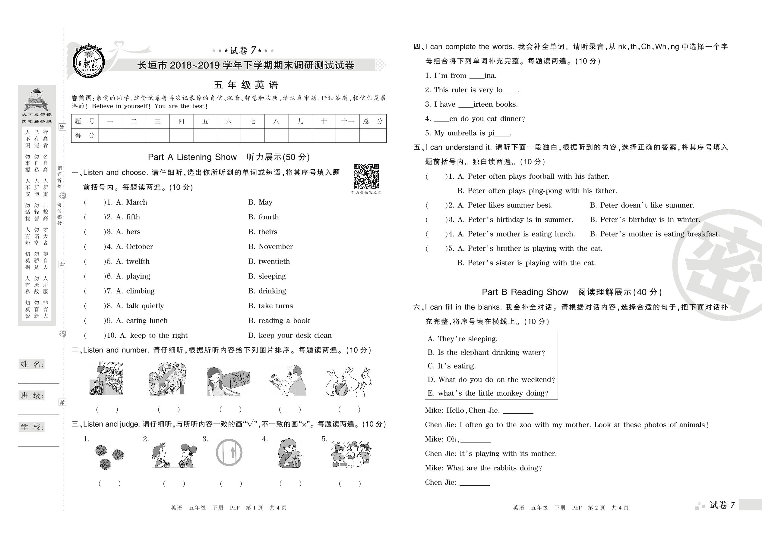 2018-2019学年第二学期长垣市五年级英语试卷(PEP版)【7】