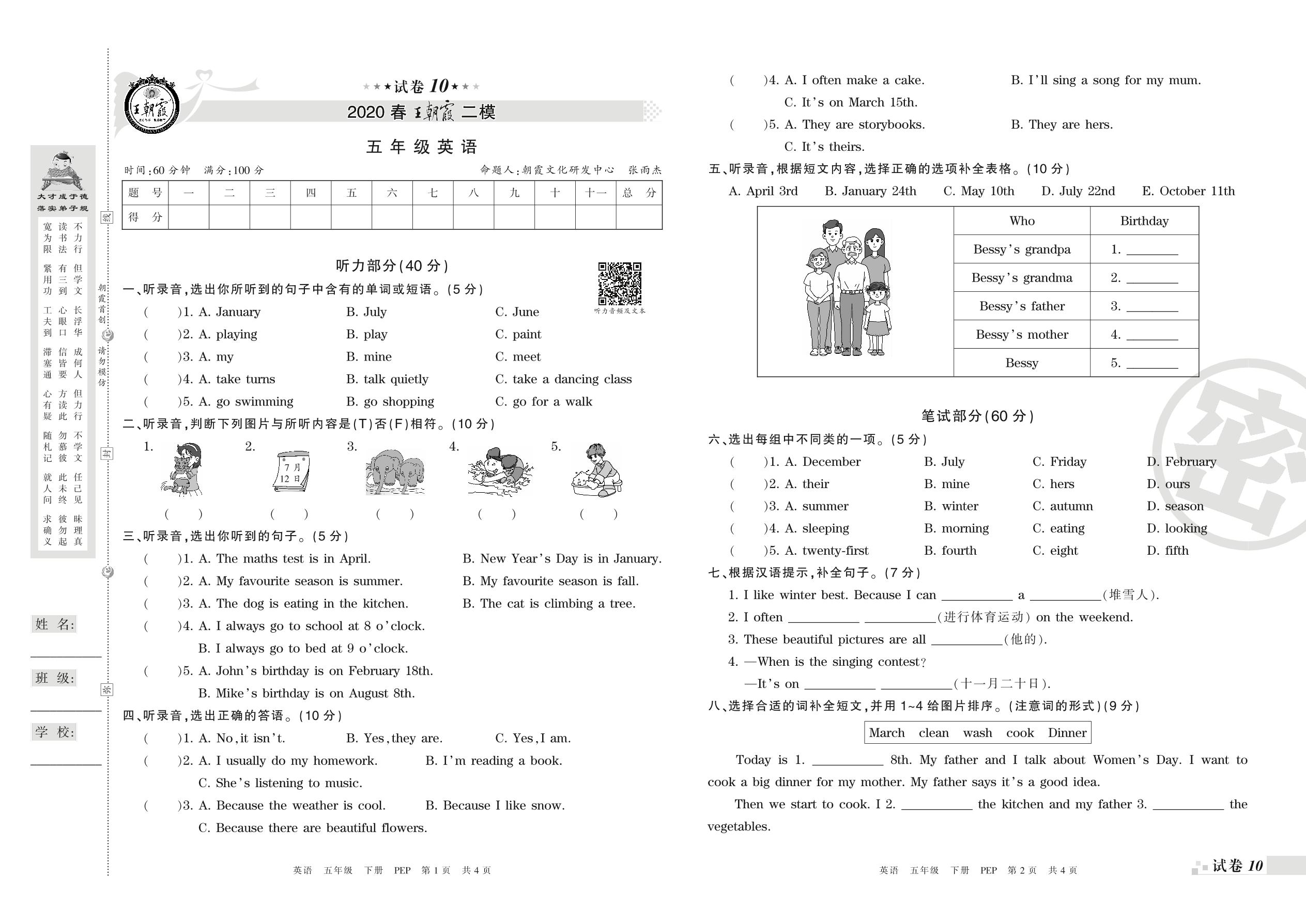 王朝霞期末模拟卷五年级下册英语(PEP版)_R210807142736【10】