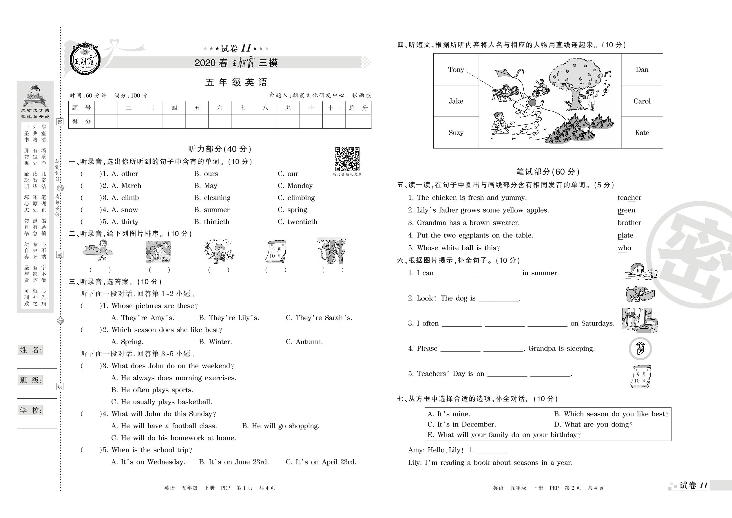 王朝霞期末模拟卷五年级下册英语(PEP版)_R210807142741【11】