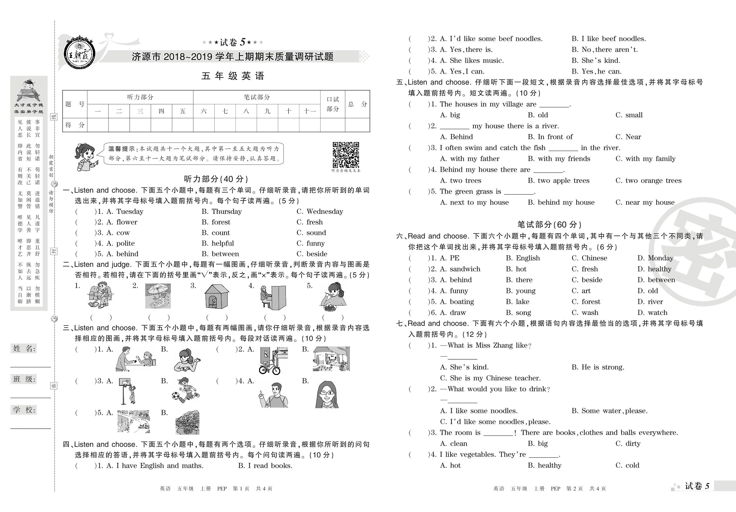 2018-2019学年第一学期济源市五年级英语试卷(PEP版)【5】