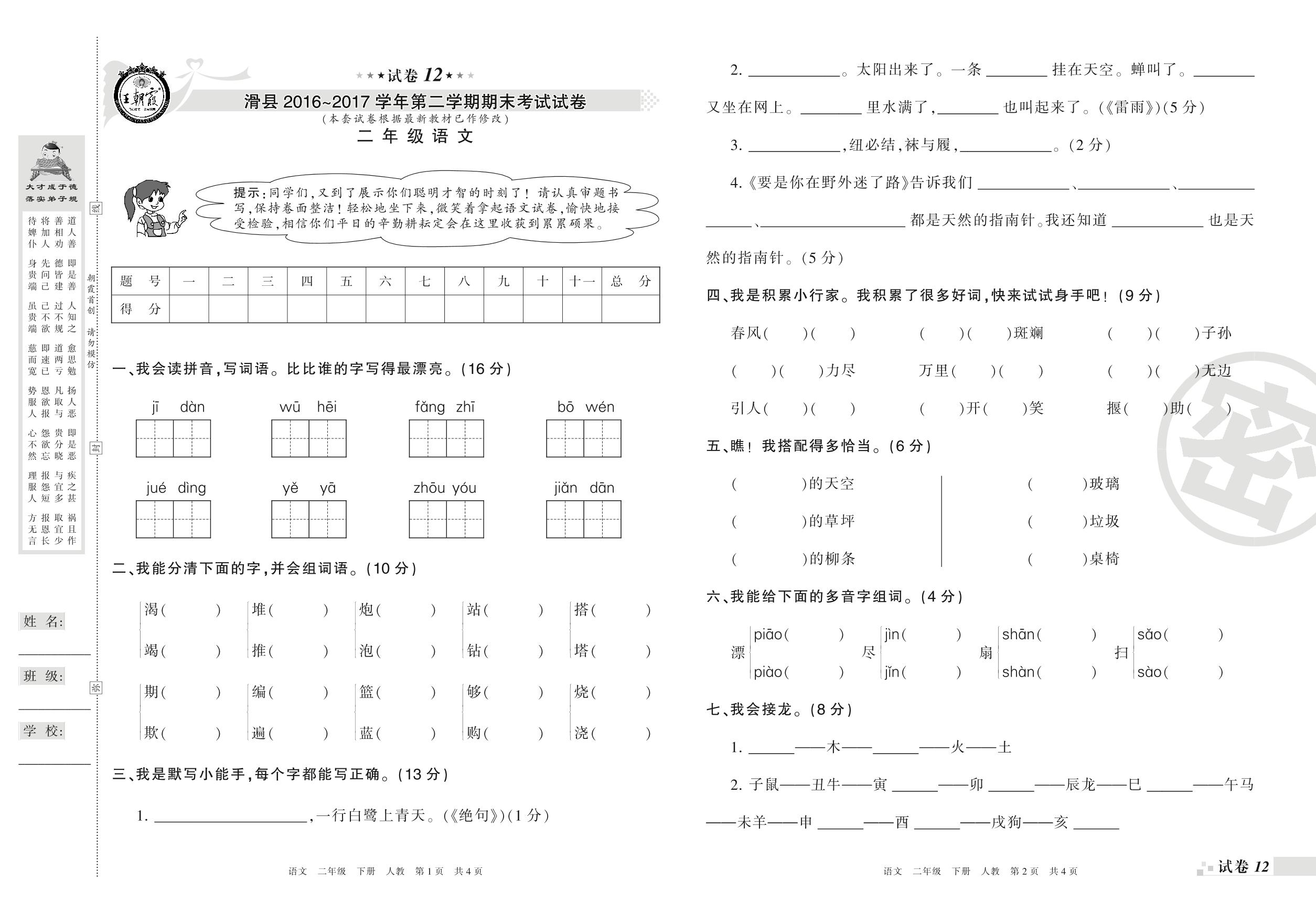 2016-2017学年第二学期安阳市滑县二年级语文试卷(人教版)【12】