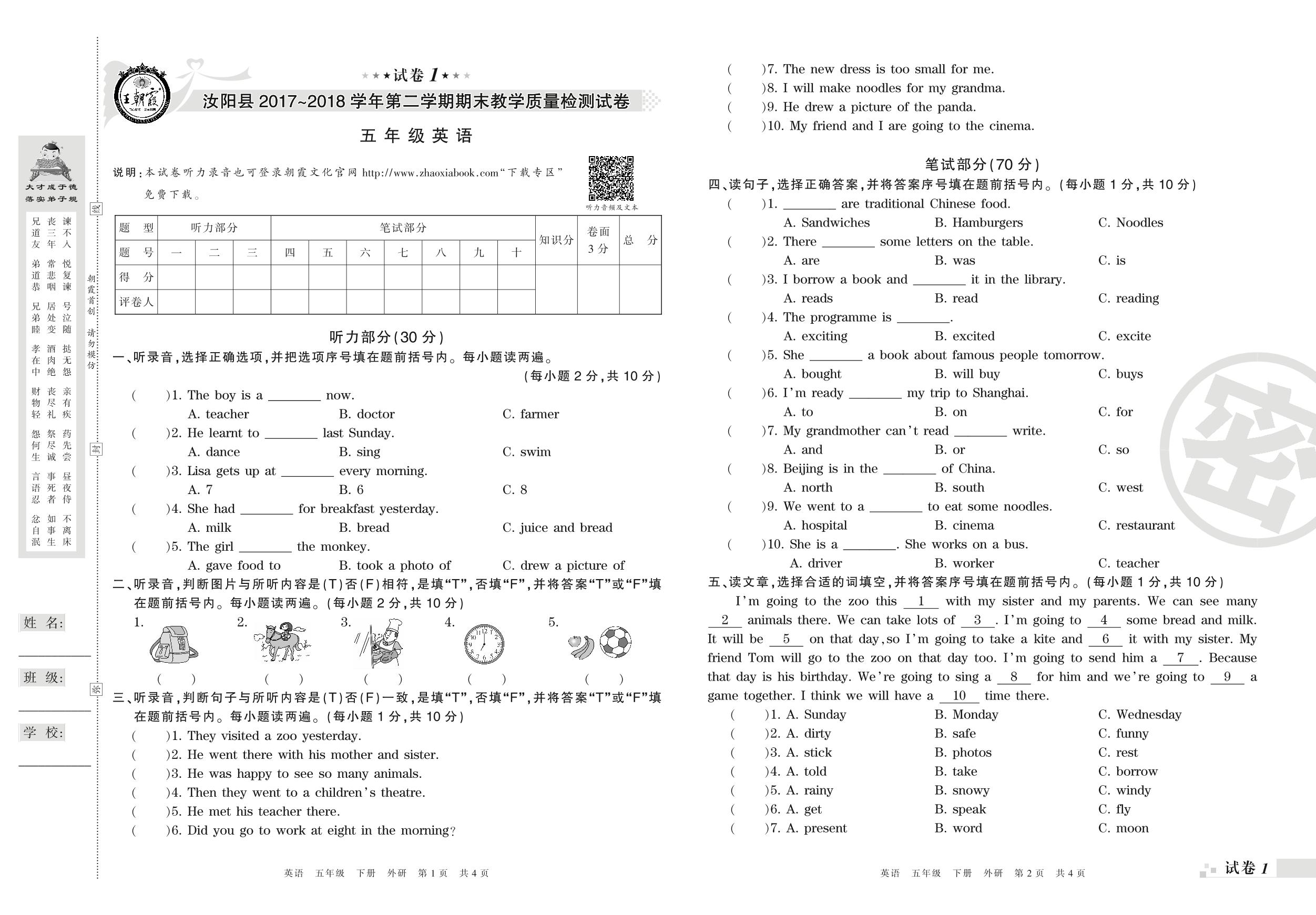 2017-2018学年第二学期洛阳市汝阳县五年级英语试卷(外研版)【1】