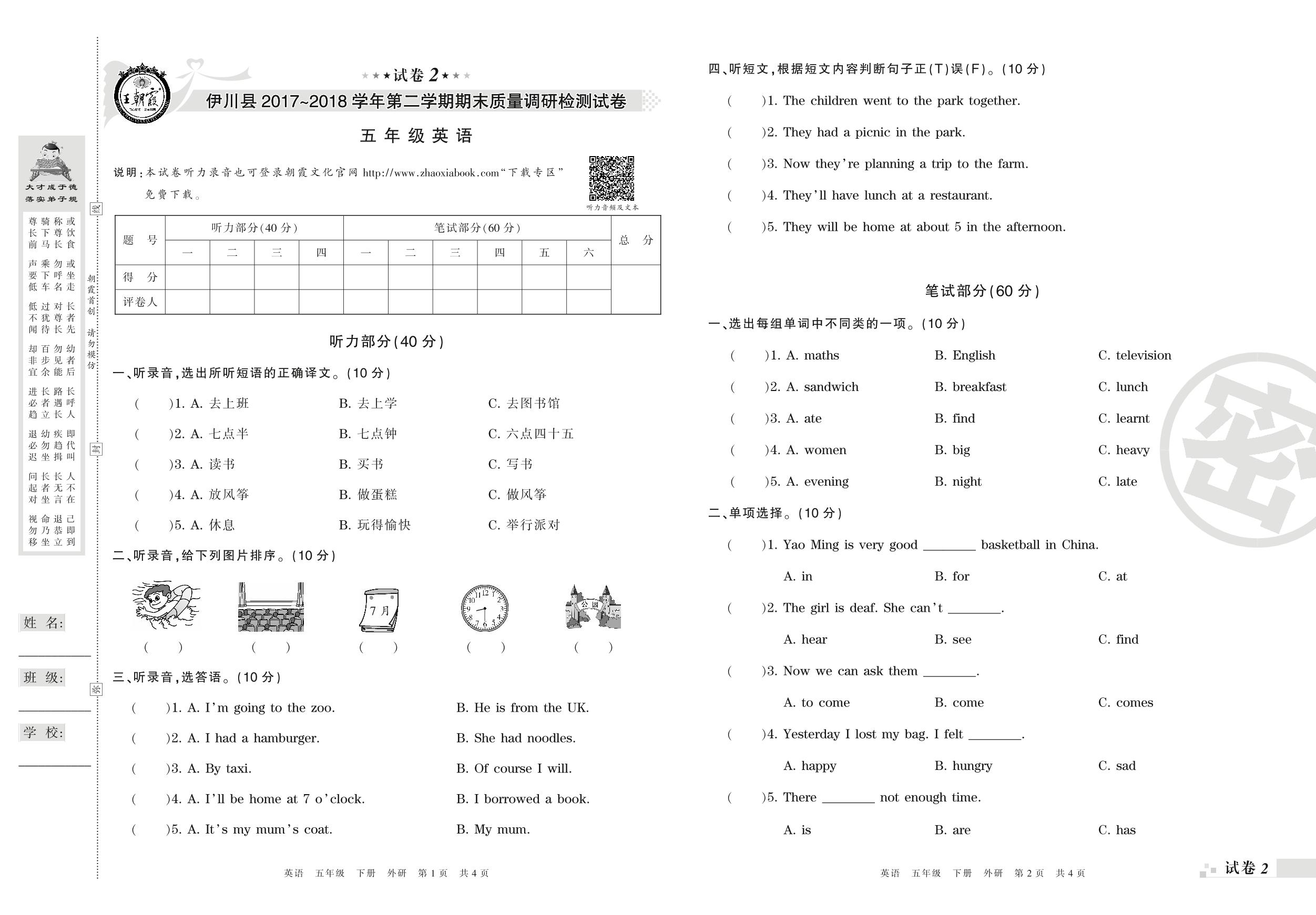 2017-2018学年第二学期洛阳市伊川县五年级英语试卷(外研版)【2】