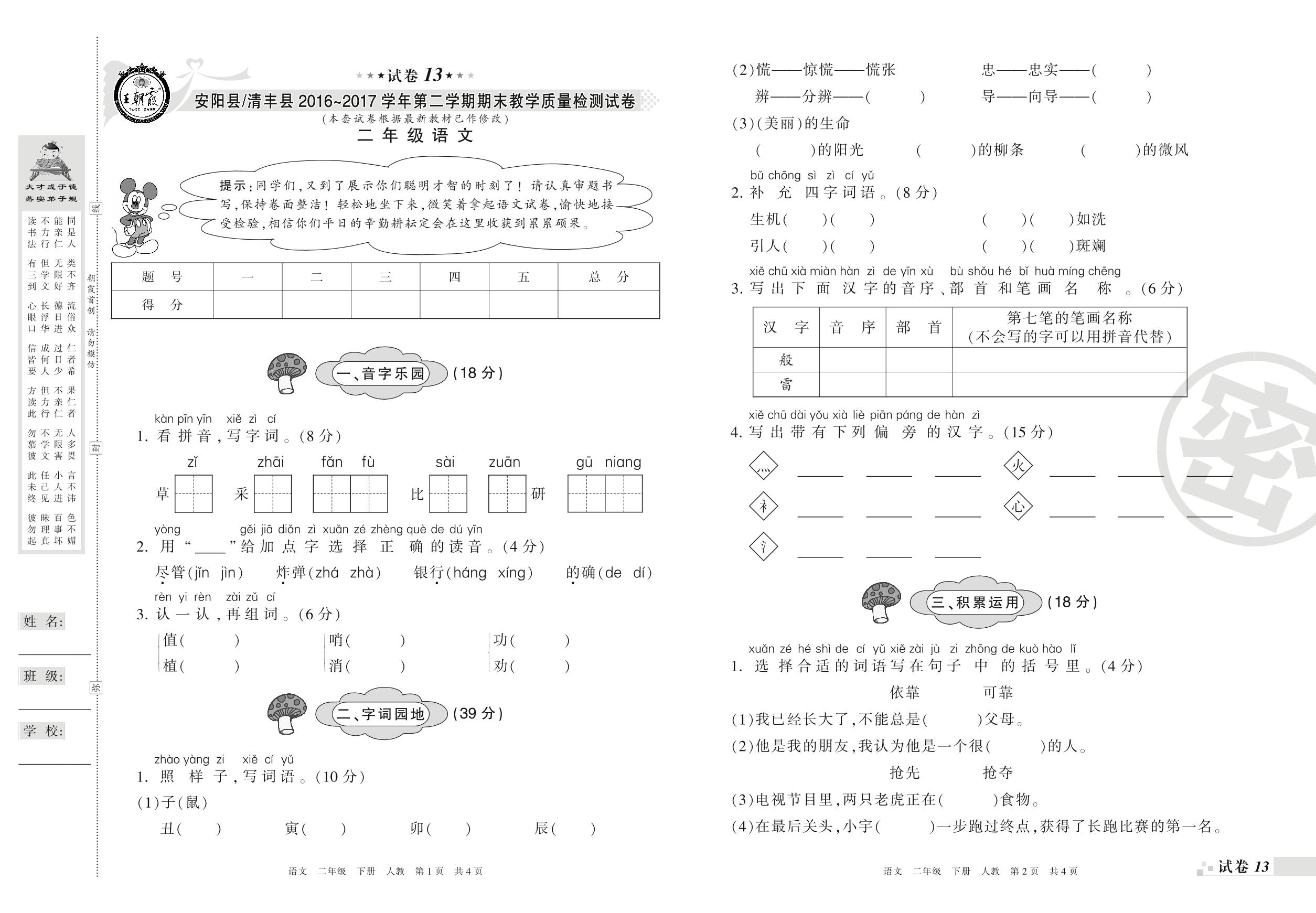 2016-2017学年第二学期安阳市安阳县清丰县二年级语文试卷(人教版)【13】