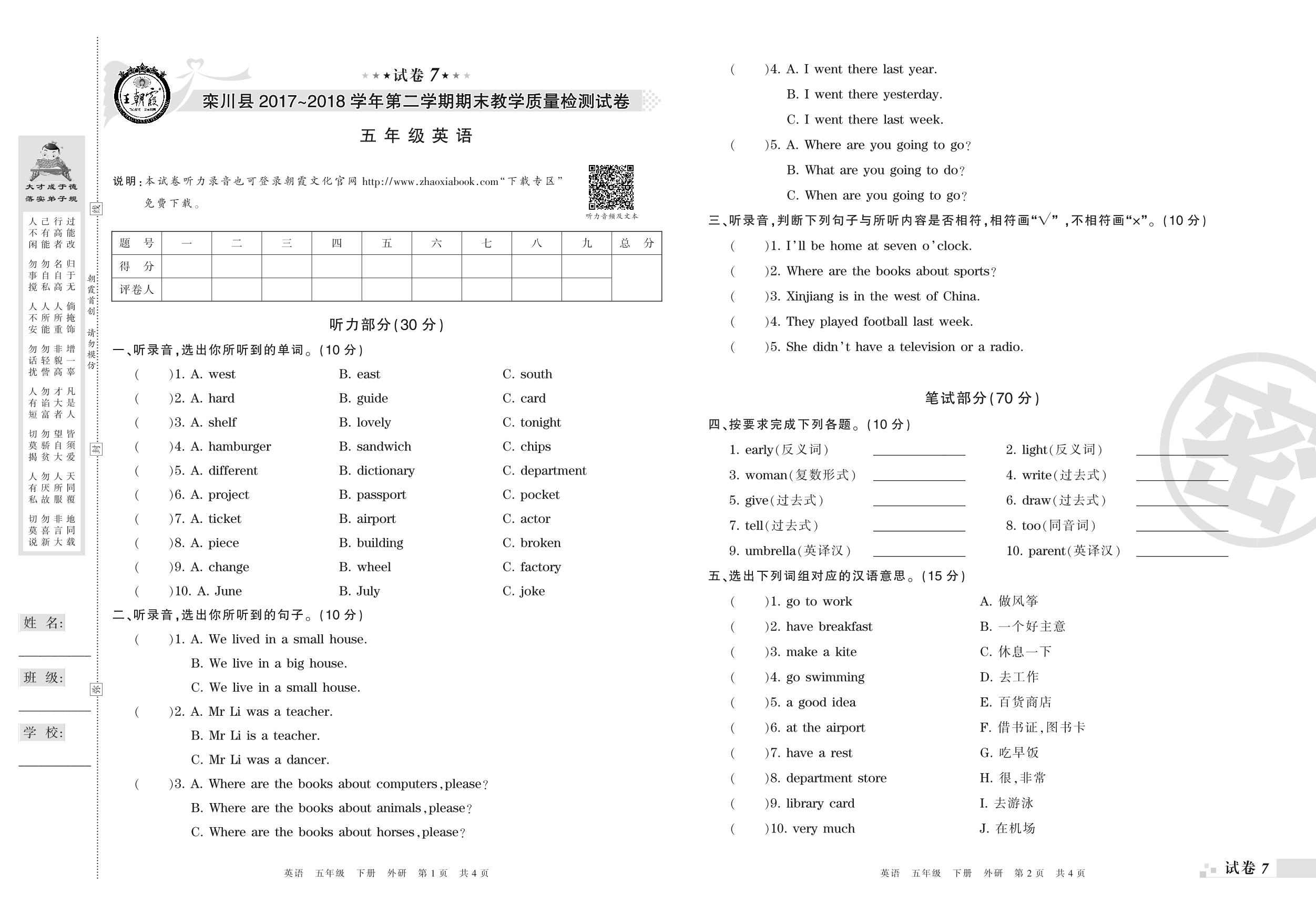 2017-2018学年第二学期洛阳市栾川县五年级英语试卷(外研版)【7】