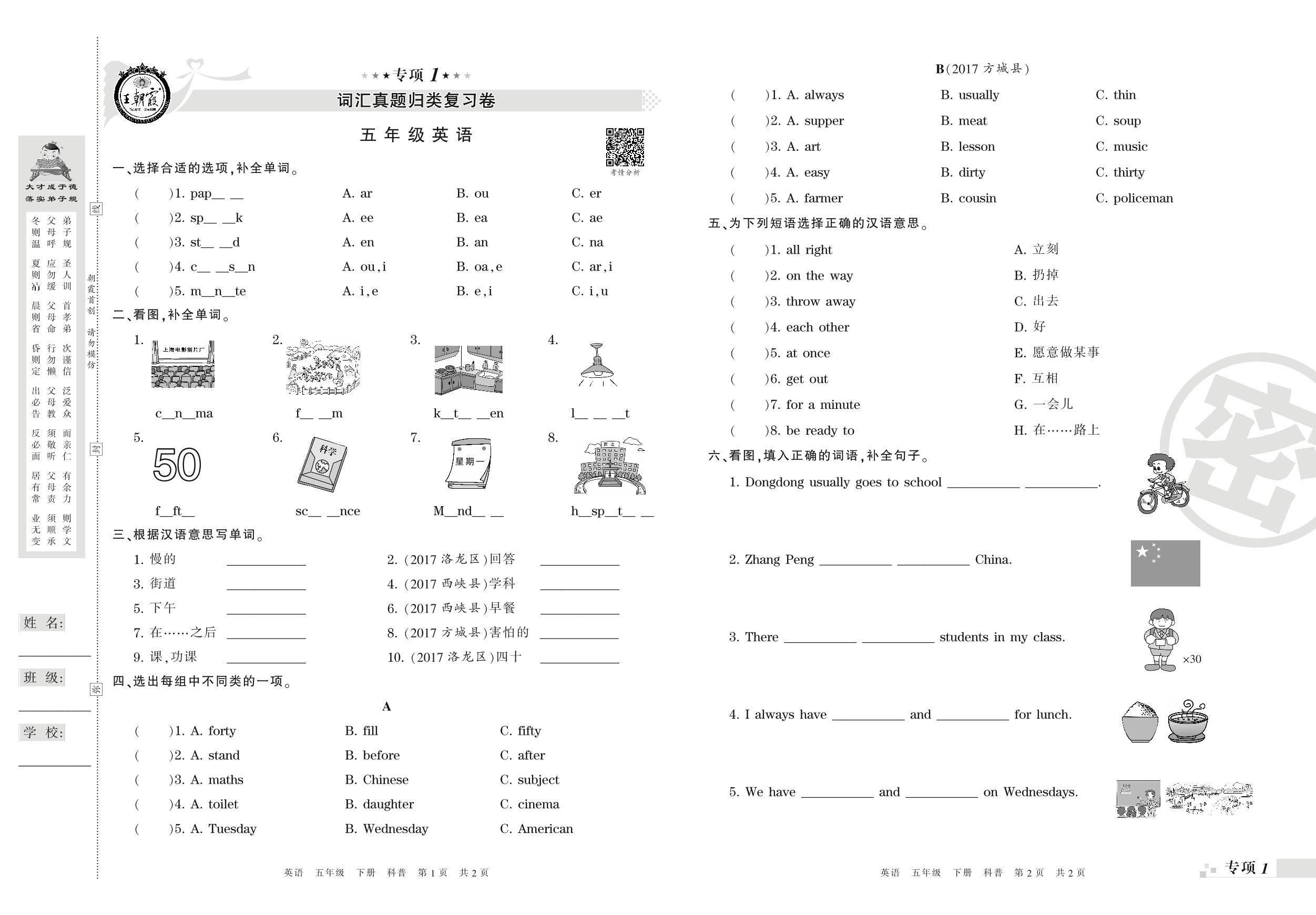 王朝霞期末专项卷——词汇、句子真题归类复习卷五年级下册英语(科普版)_R210807143052【0】