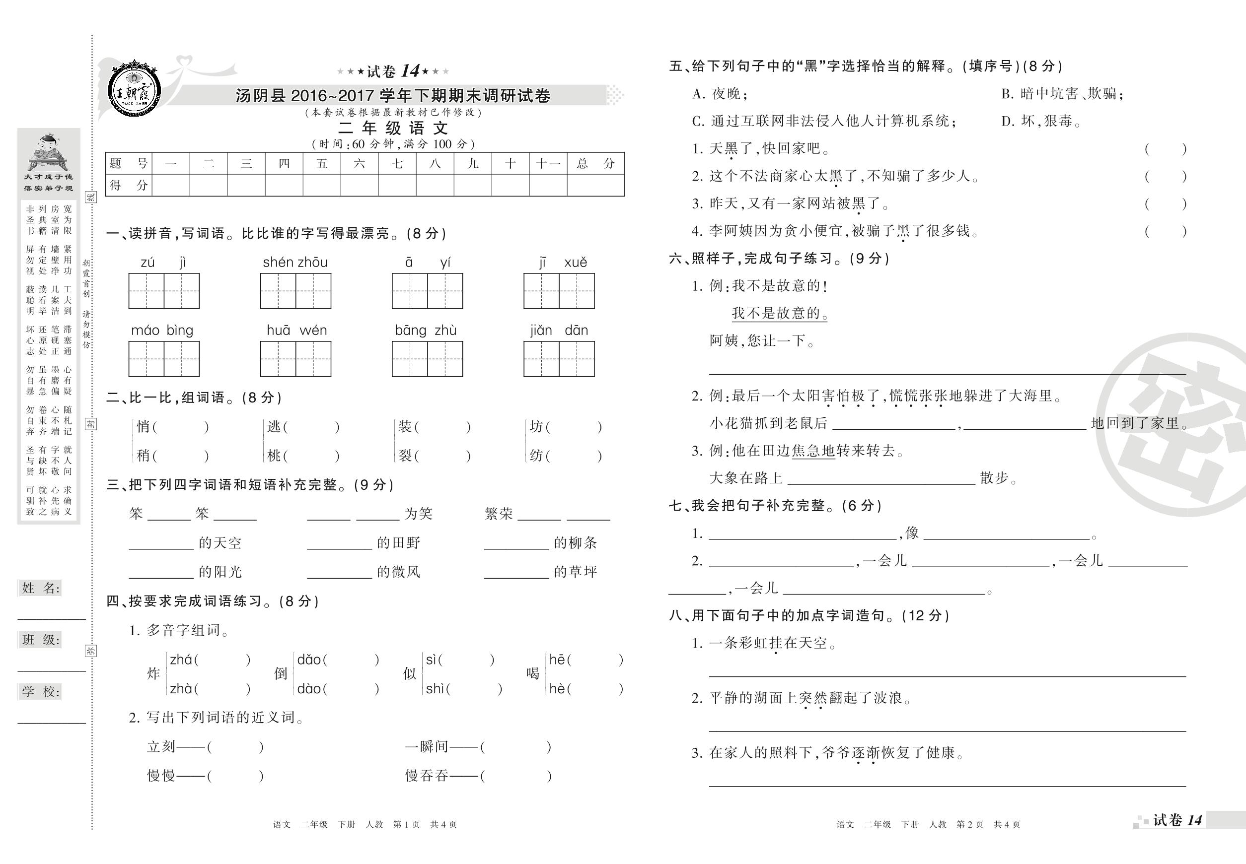 2016-2017学年第二学期安阳市汤阴县二年级语文试卷(人教版)【14】