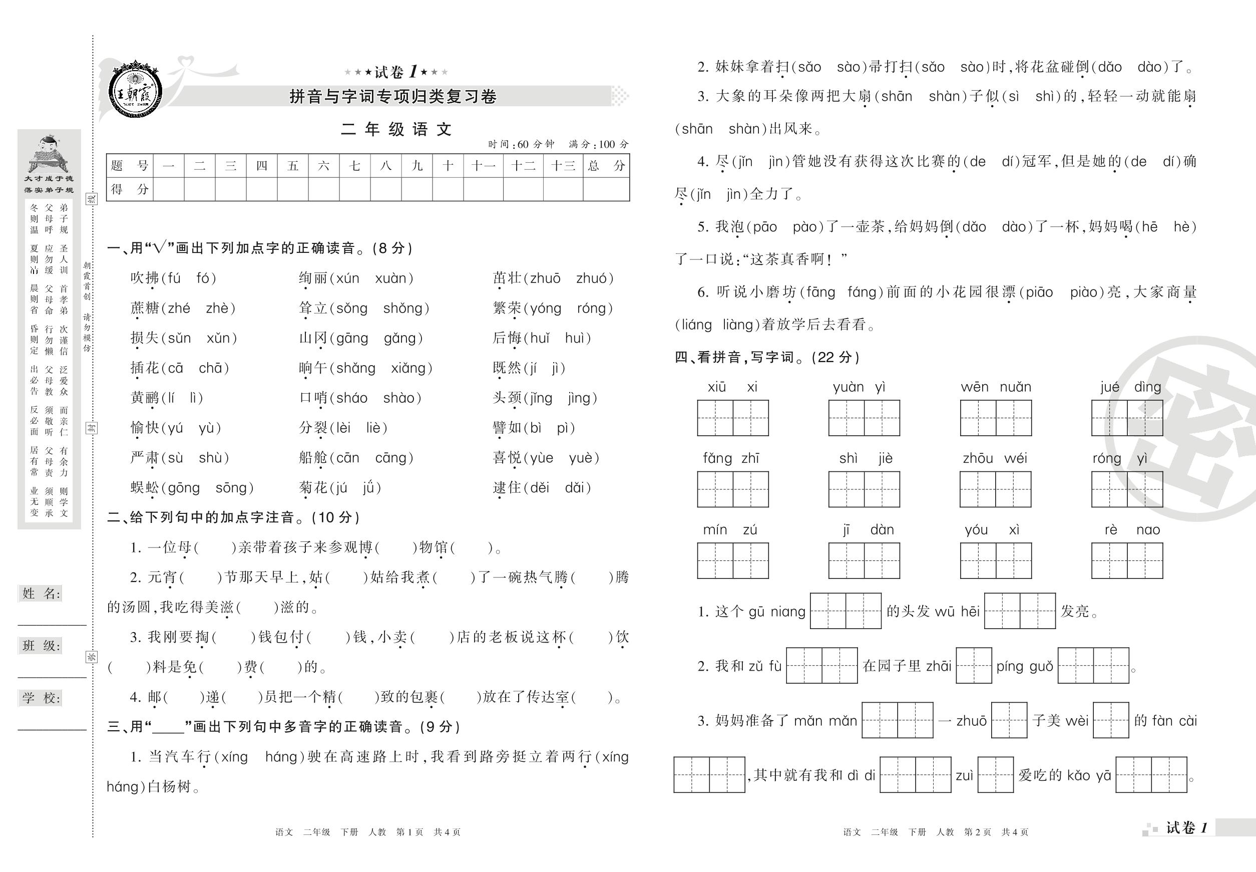 王朝霞期末专项卷——拼音与字词专项归类复习卷二年级下册语文(人教版)_R21080182121【1】