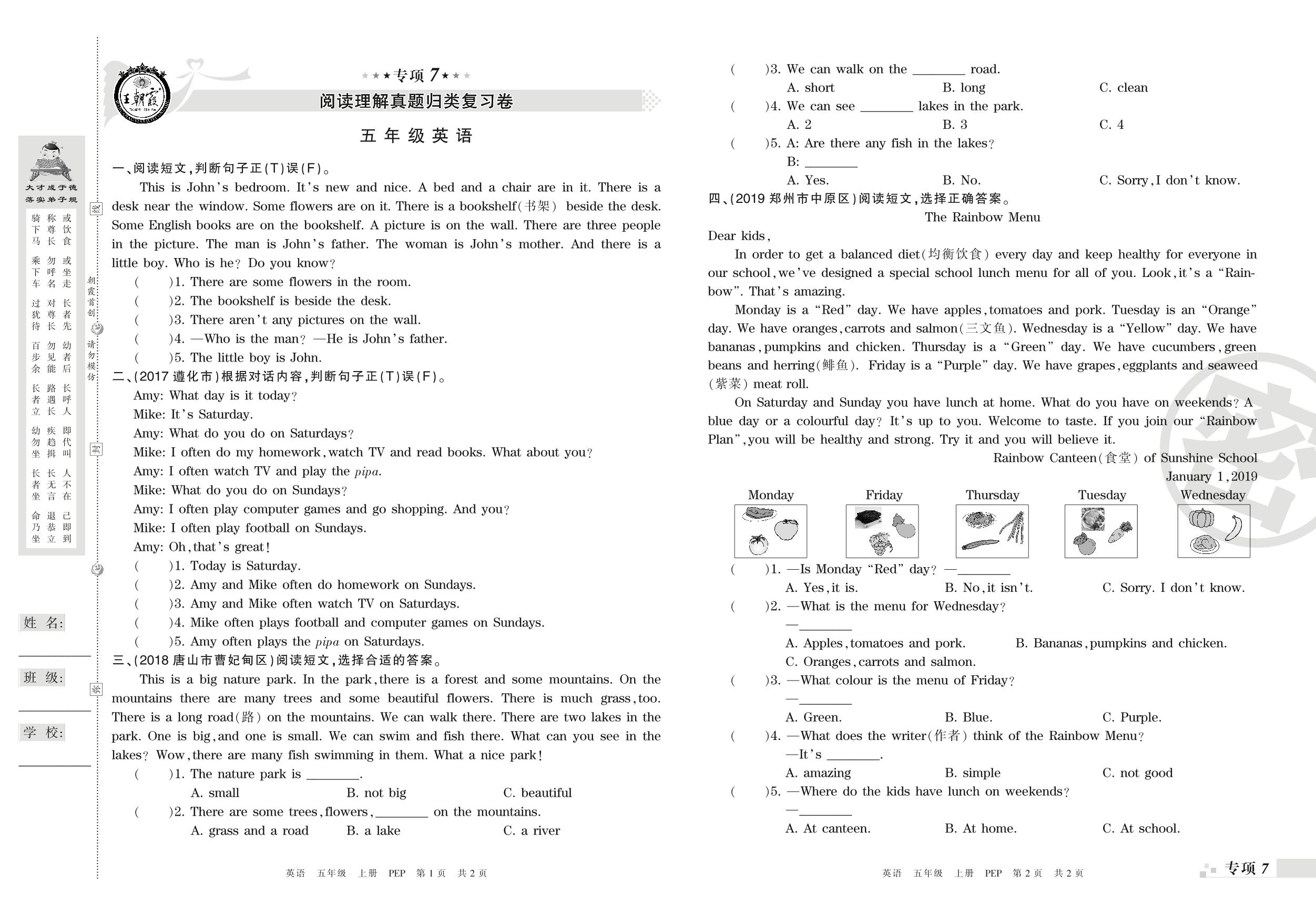 王朝霞期末专项卷——阅读理解、写作真题归类复习五年级上册英语(PEP版)_R210807143147【0】