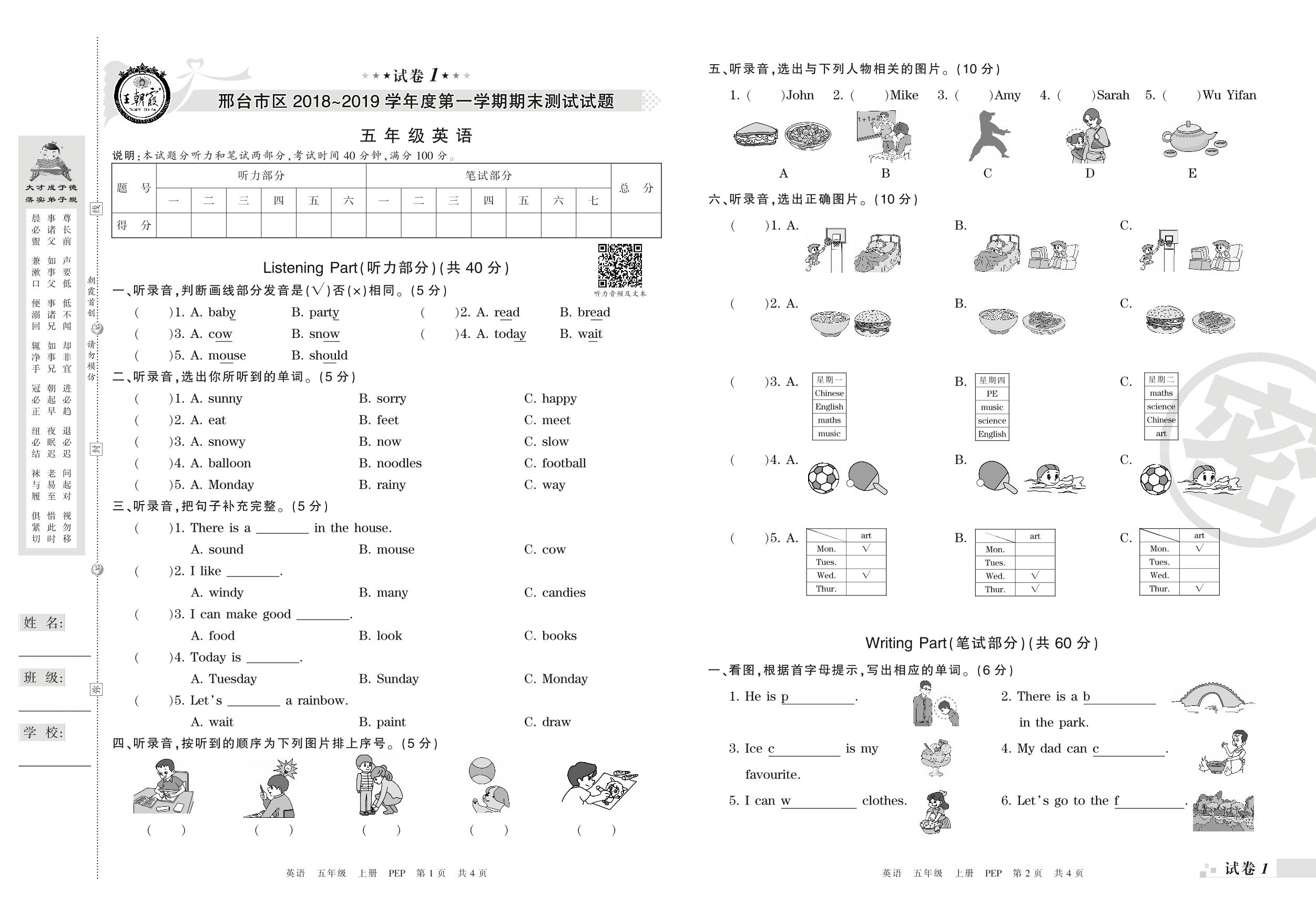 2018-2019学年第一学期邢台市区五年级英语试卷(PEP版)【1】