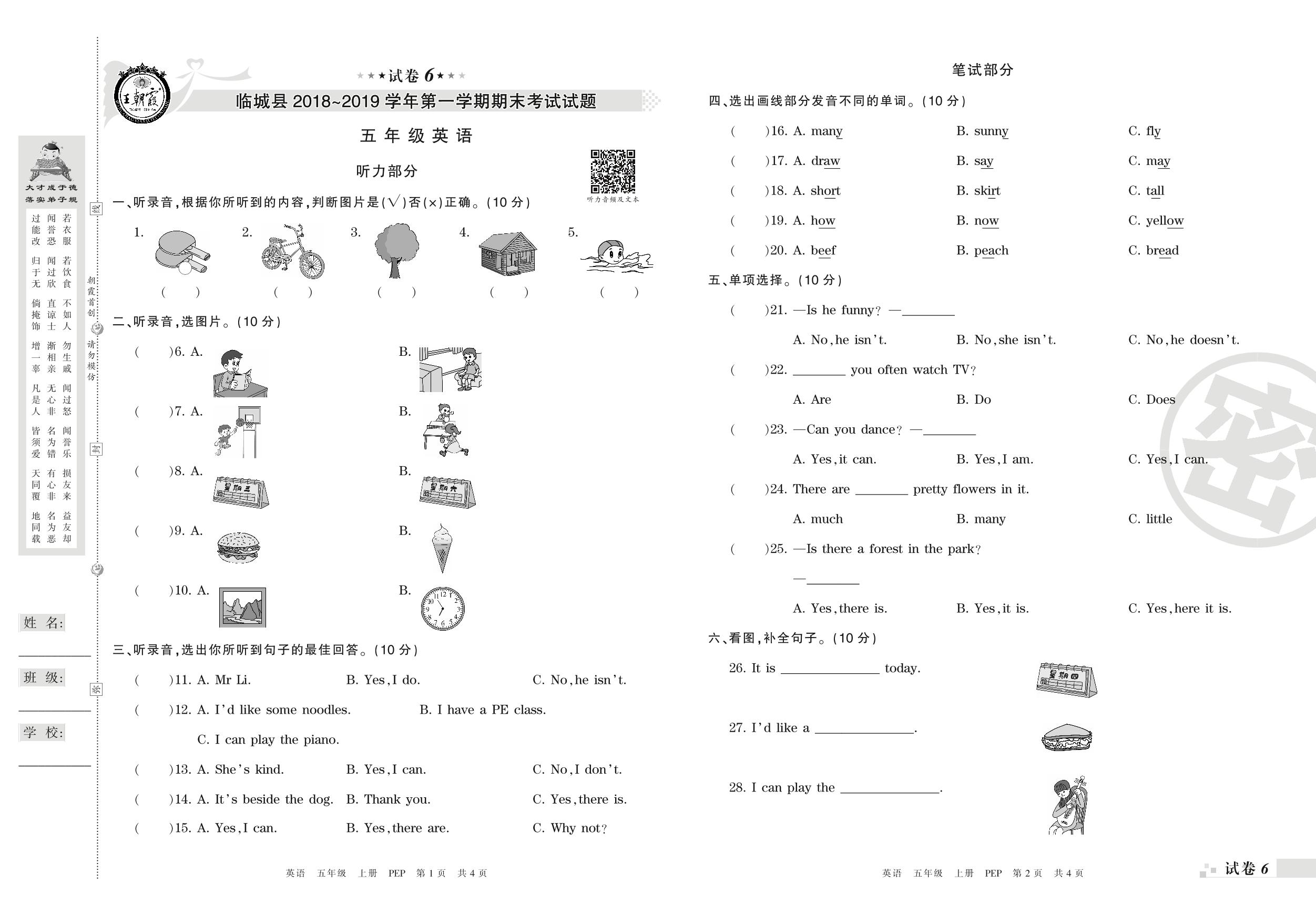 2018-2019学年第一学期邢台市临城县五年级英语试卷(PEP版)【6】