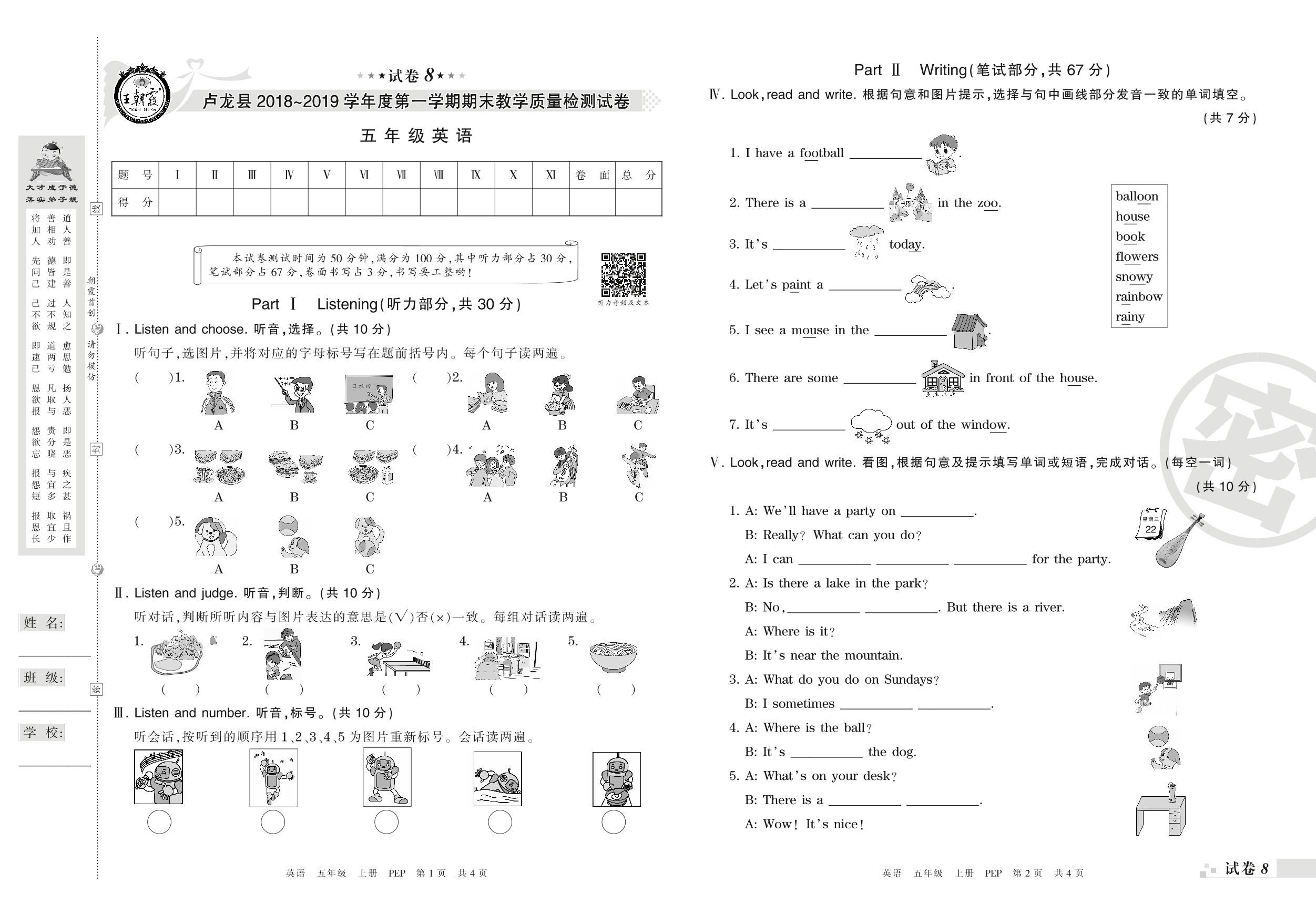 2018-2019学年第一学期秦皇岛市卢龙县五年级英语试卷(PEP版)【8】
