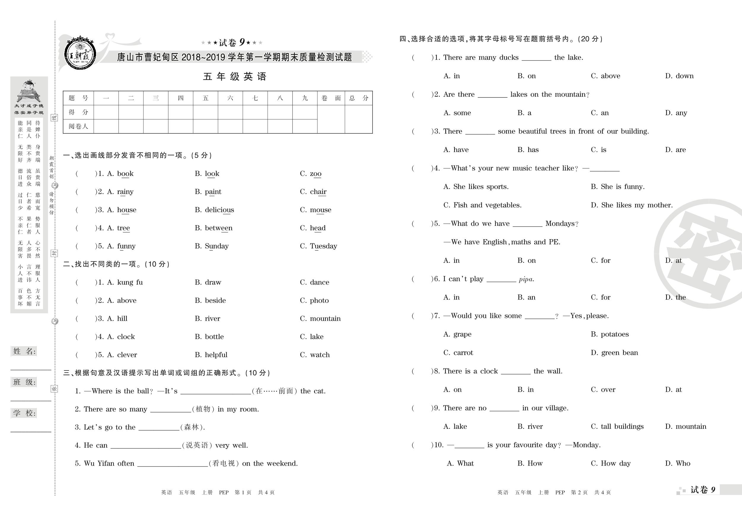 2018-2019学年第一学期唐山市曹妃甸区五年级英语试卷(PEP版)【9】