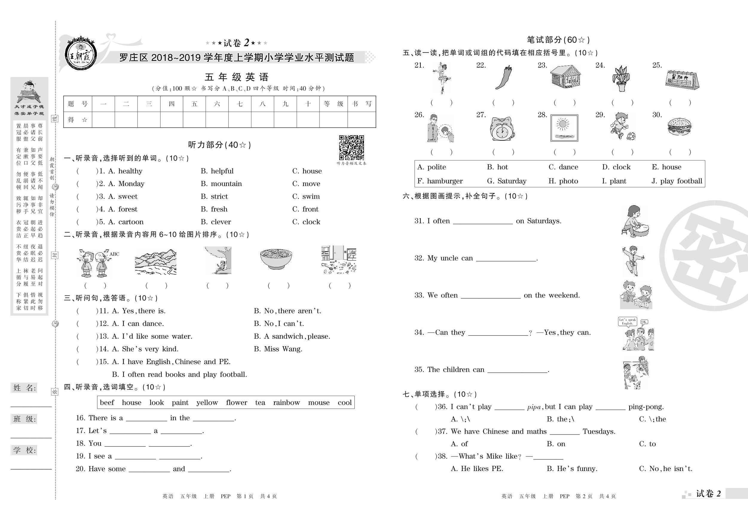 2018-2019学年第一学期临沂市罗庄区五年级英语试卷(PEP版)【2】