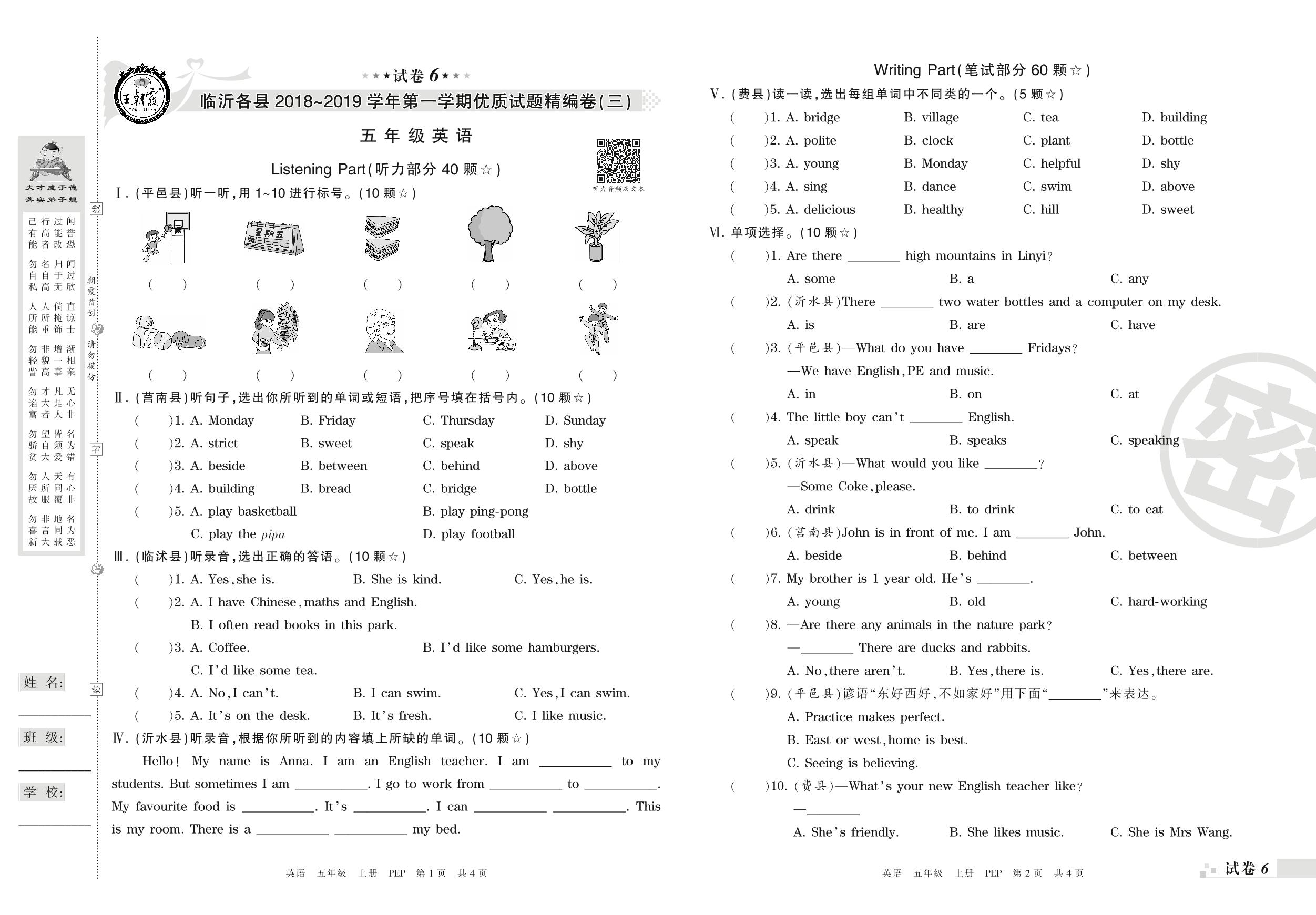 2018-2019学年第一学期临沂市各县优质试题精编卷(三)五年级英语试卷(PEP版)【6】