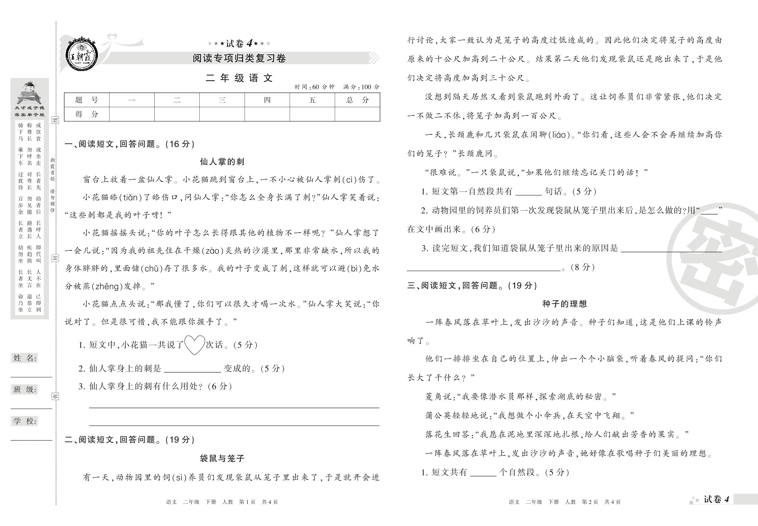 王朝霞期末专项卷——阅读专项归类复习卷二年级下册语文(人教版)_R21080182134【4】