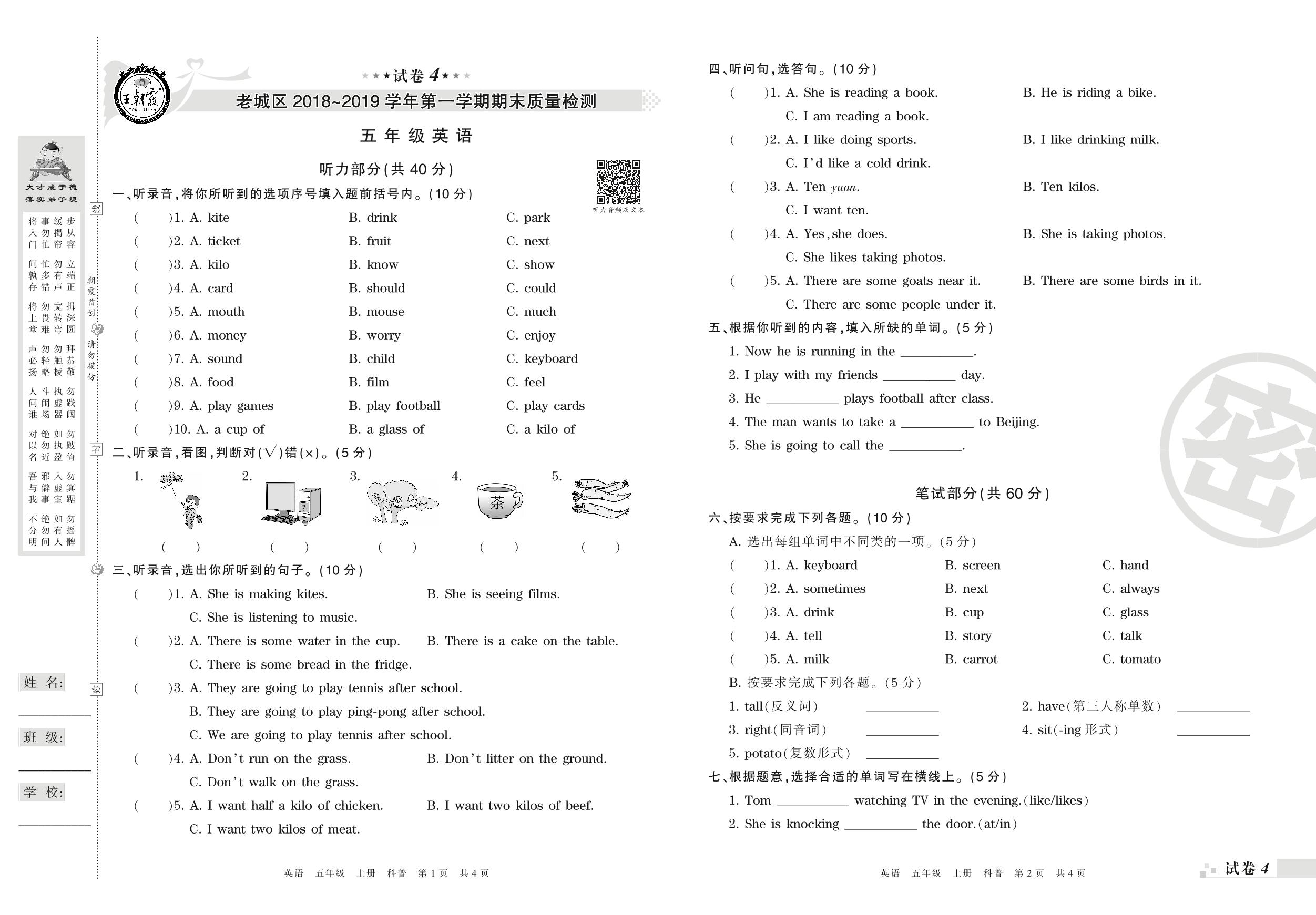 2018-2019学年第一学期洛阳市老城区五年级英语试卷(科普版)【4】