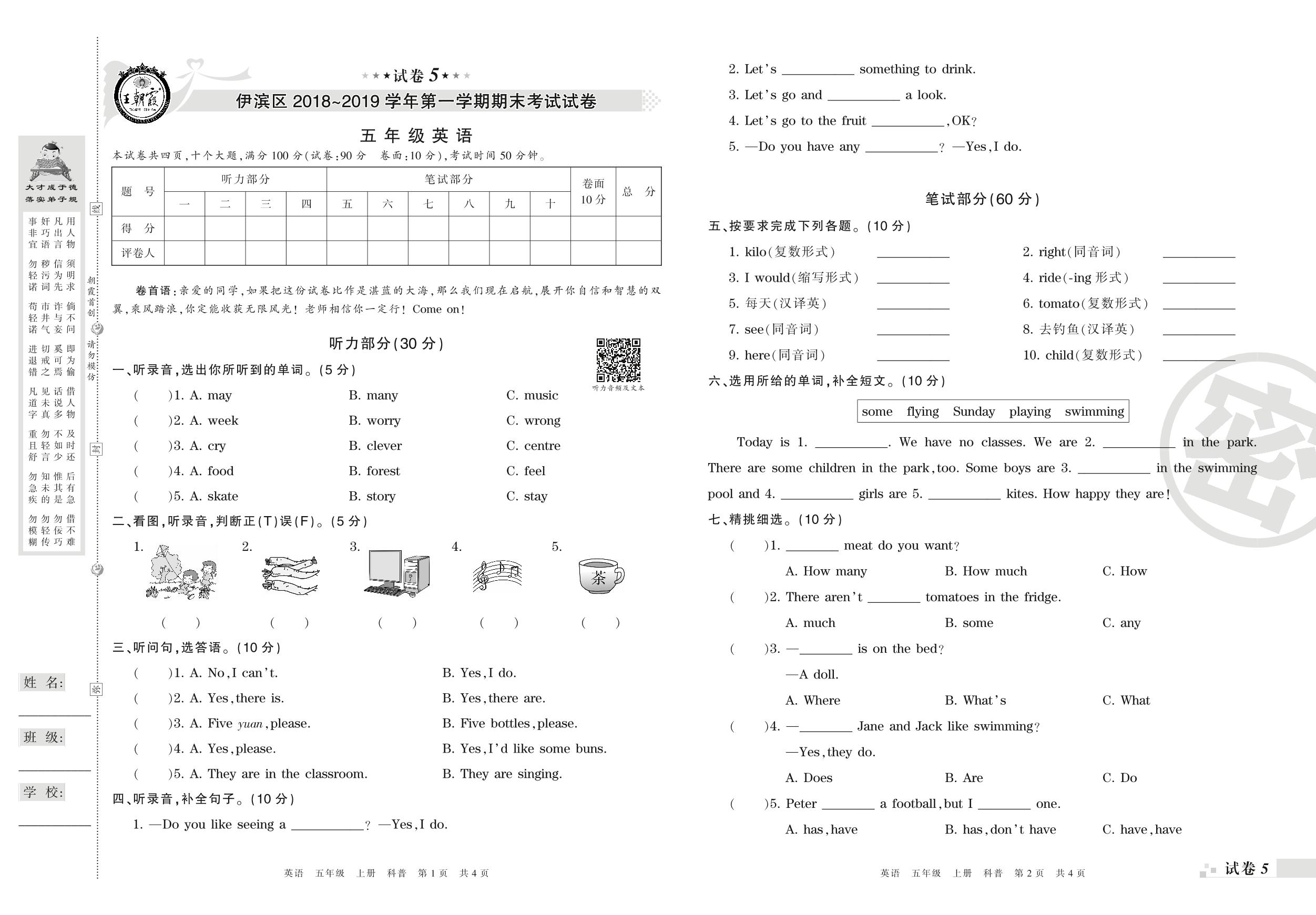 2018-2019学年第一学期洛阳市伊滨区五年级英语试卷(科普版)【5】