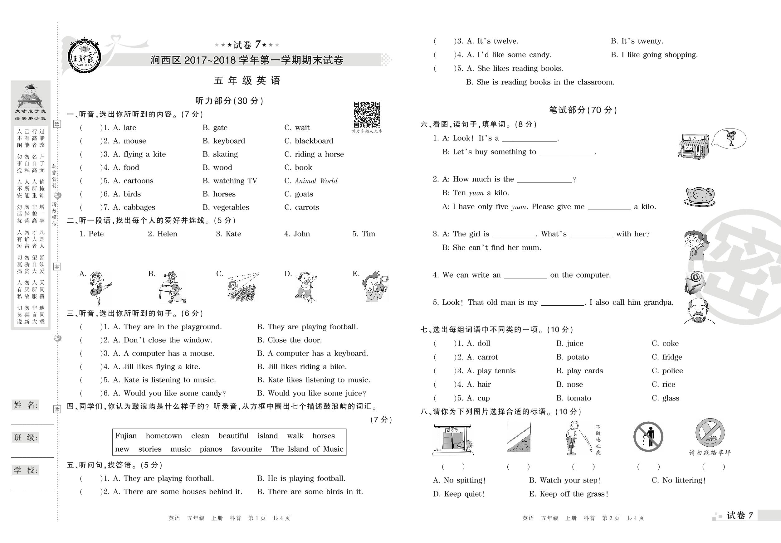 2017-2018学年第一学期洛阳市涧西区五年级英语试卷(科普版)【7】