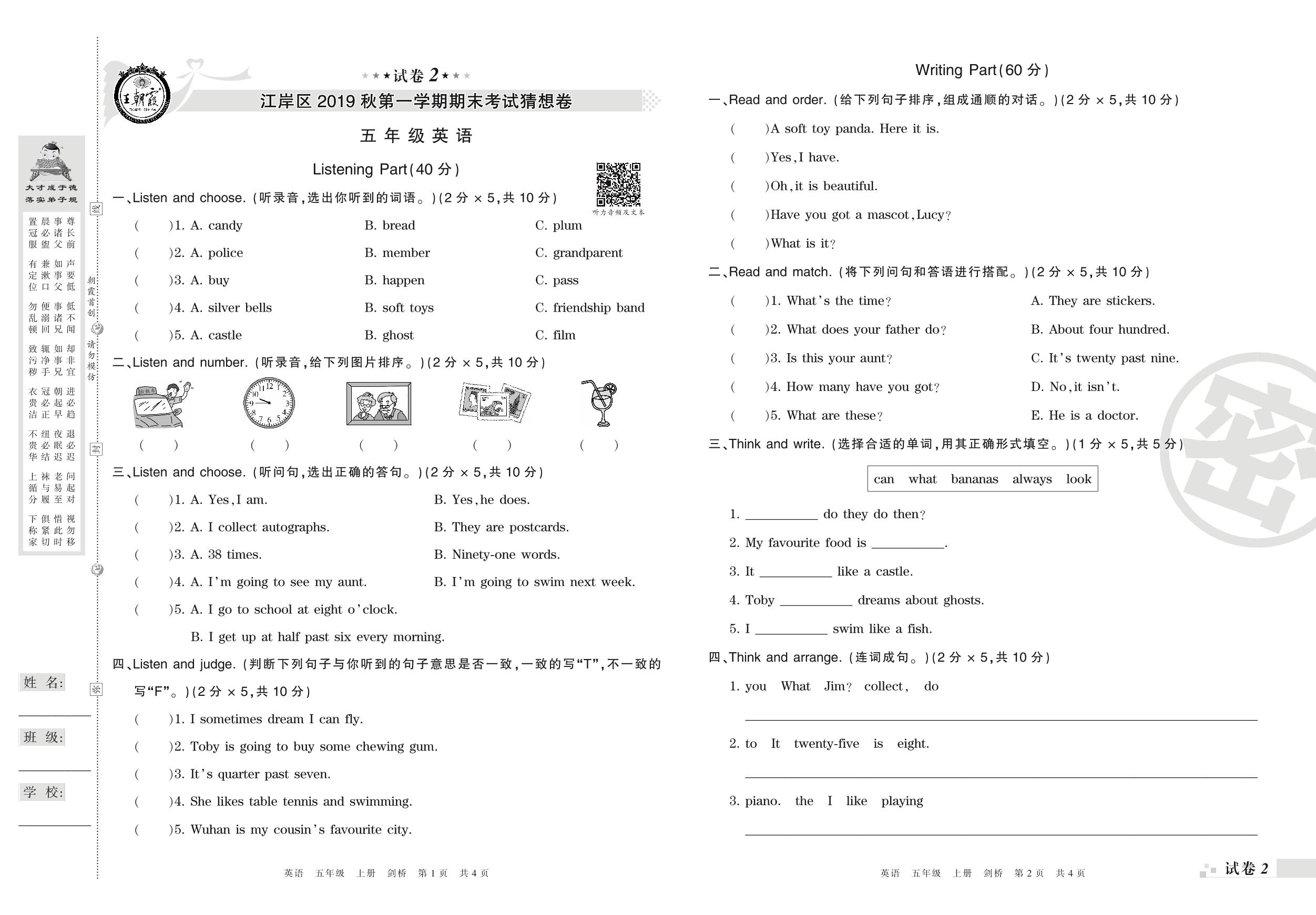 2018-2019学年第一学期武汉市江岸区猜想卷五年级英语试卷(剑桥版)【2】