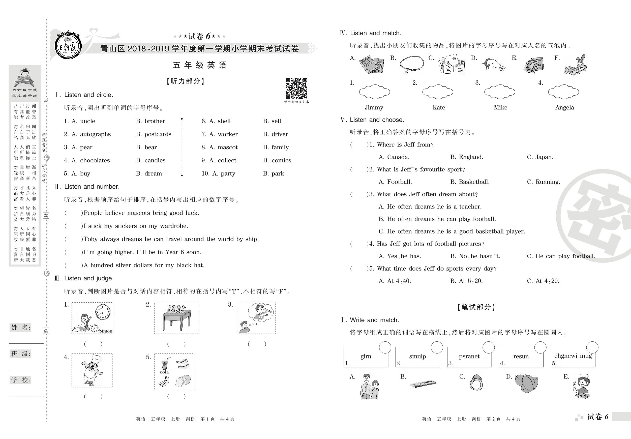 2018-2019学年第一学期武汉市青山区五年级英语试卷(剑桥版)【6】