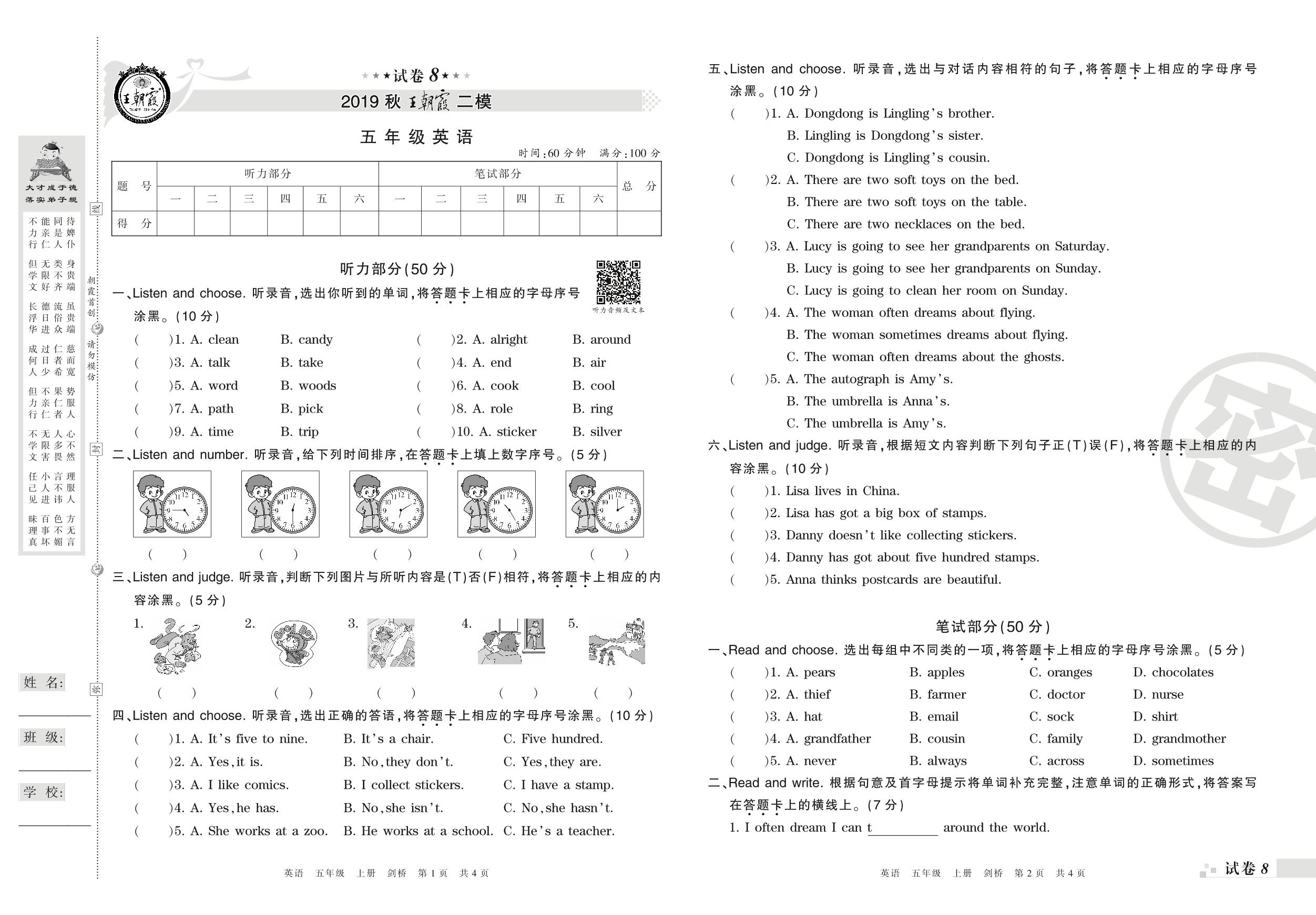 王朝霞期末模拟卷五年级上册英语(剑桥版)_R210807143455【8】