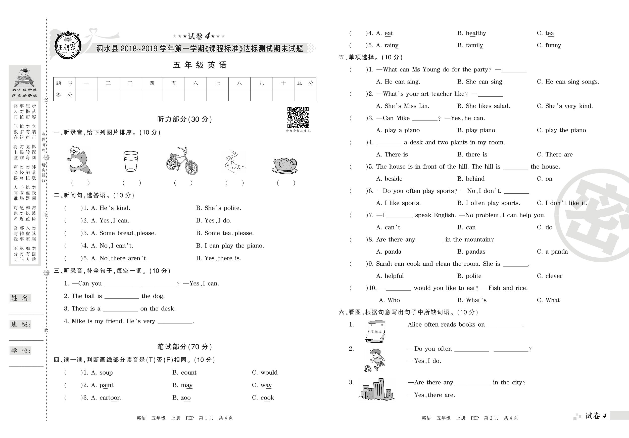 2018-2019学年第一学期济宁市泗水县五年级英语试卷(PEP版)【4】