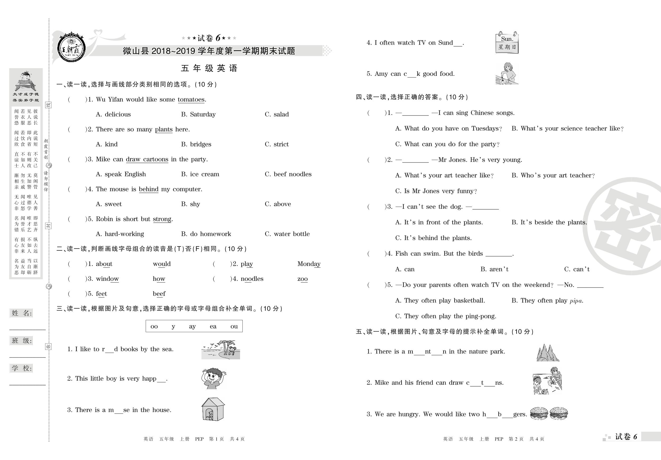 2018-2019学年第一学期济宁市微山县五年级英语试卷(PEP版)【6】