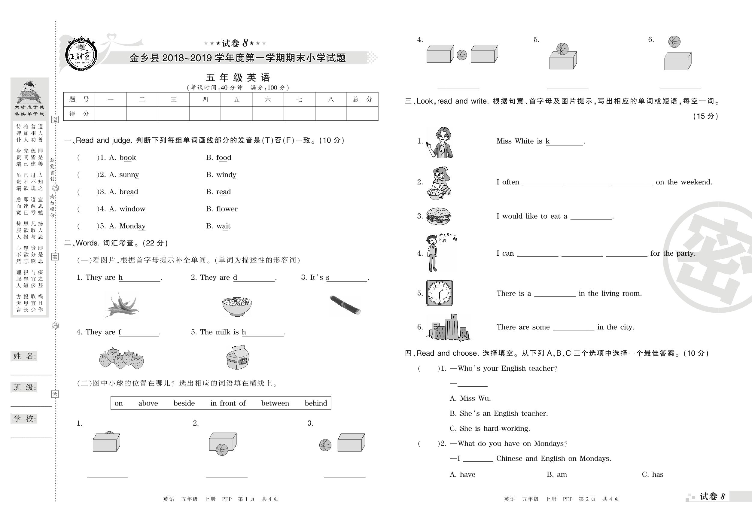 2018-2019学年第一学期济宁市金乡县五年级英语试卷(PEP版)【8】