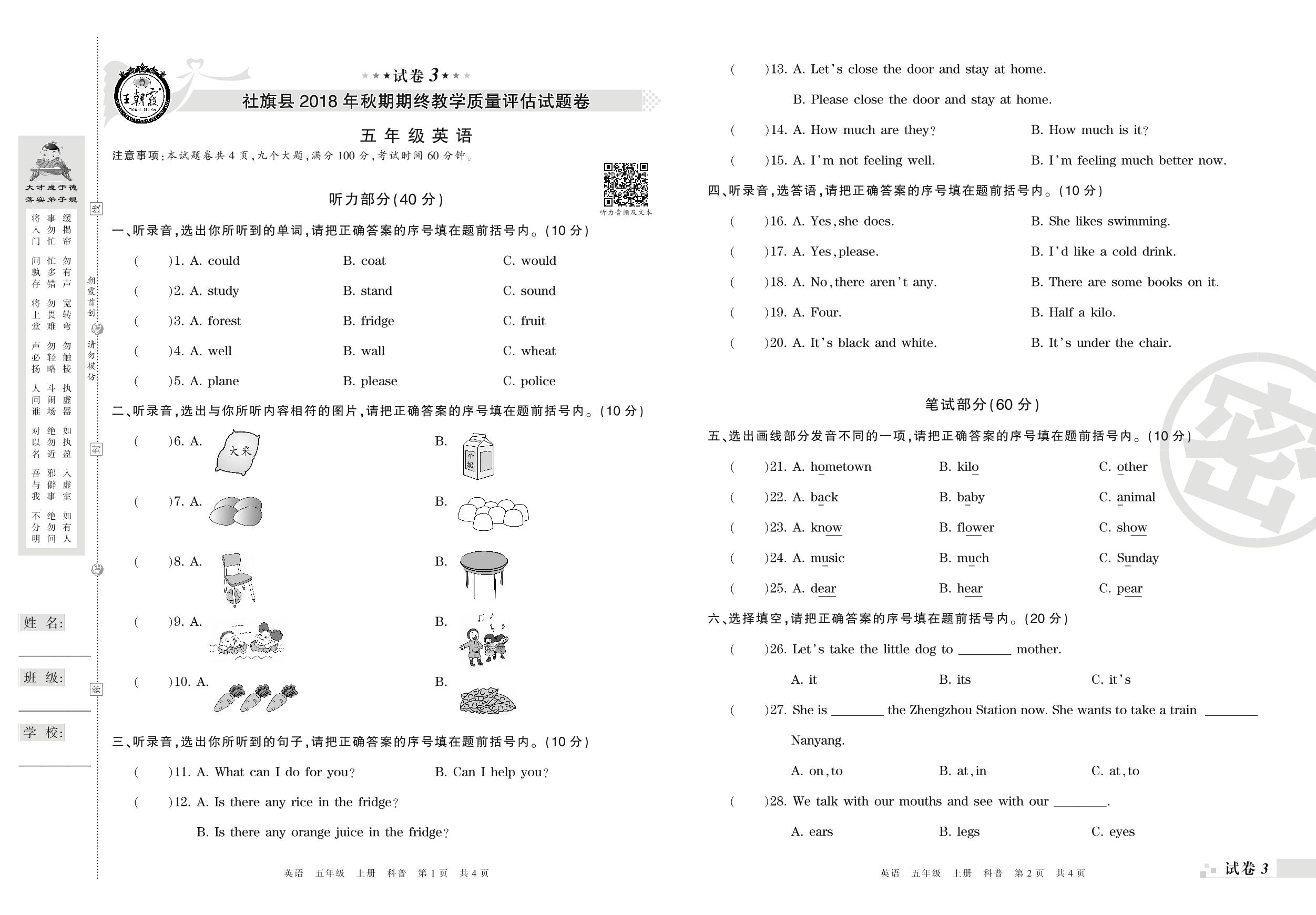 2018-2019学年第一学期南阳市社旗县五年级英语试卷(科普版)【3】