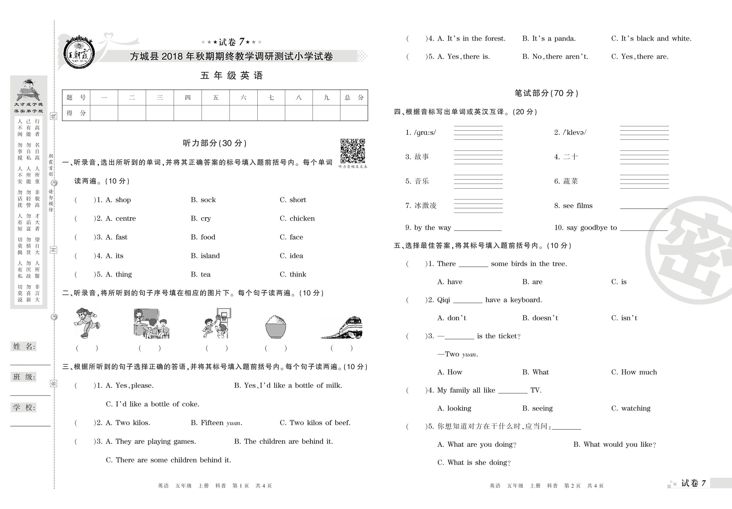 2018-2019学年第一学期南阳市方城县五年级英语试卷(科普版)【7】