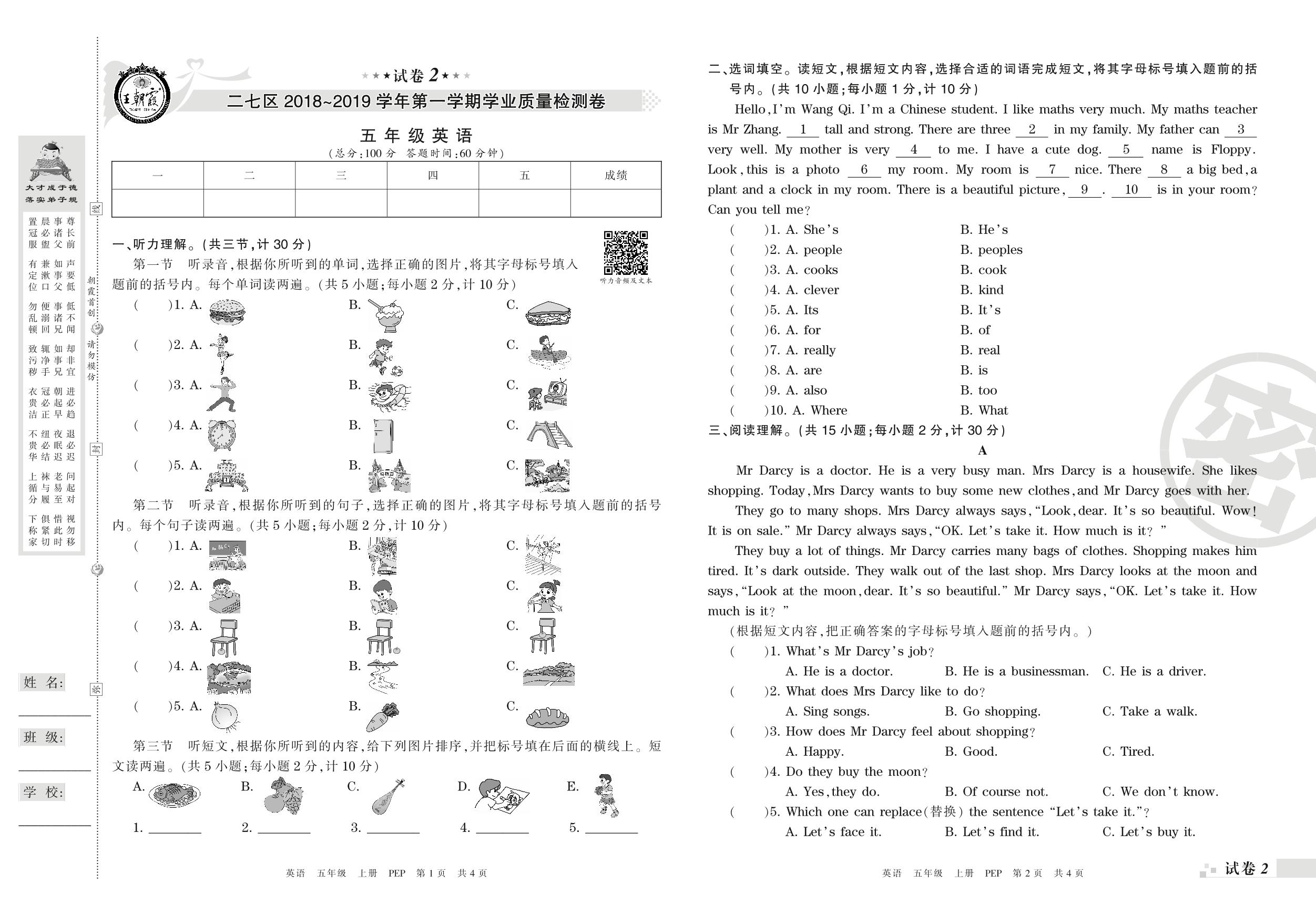 2018-2019学年第一学期郑州市二七区五年级英语试卷(PEP版)【2】