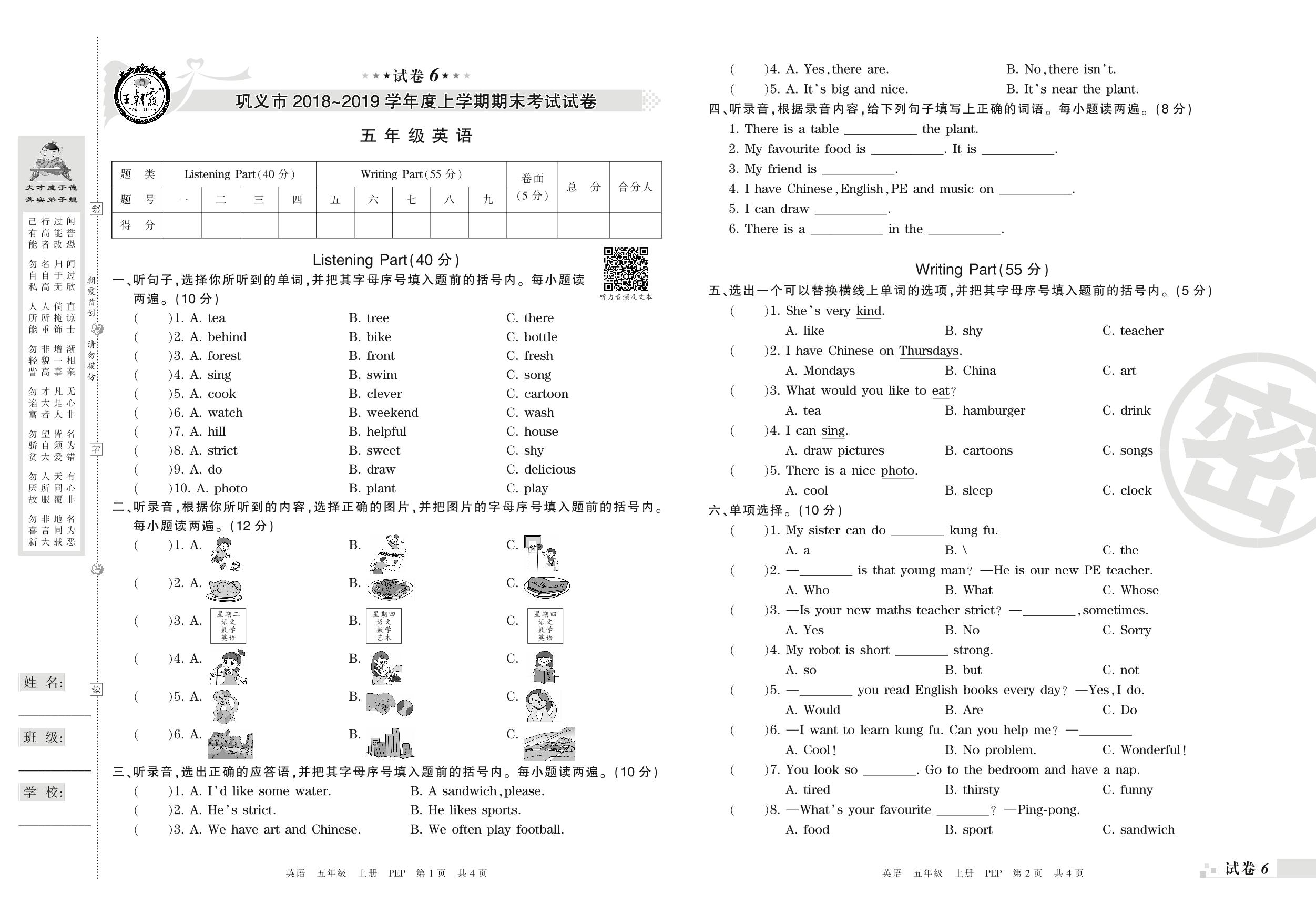 2018-2019学年第一学期巩义市五年级英语试卷(PEP版)【6】