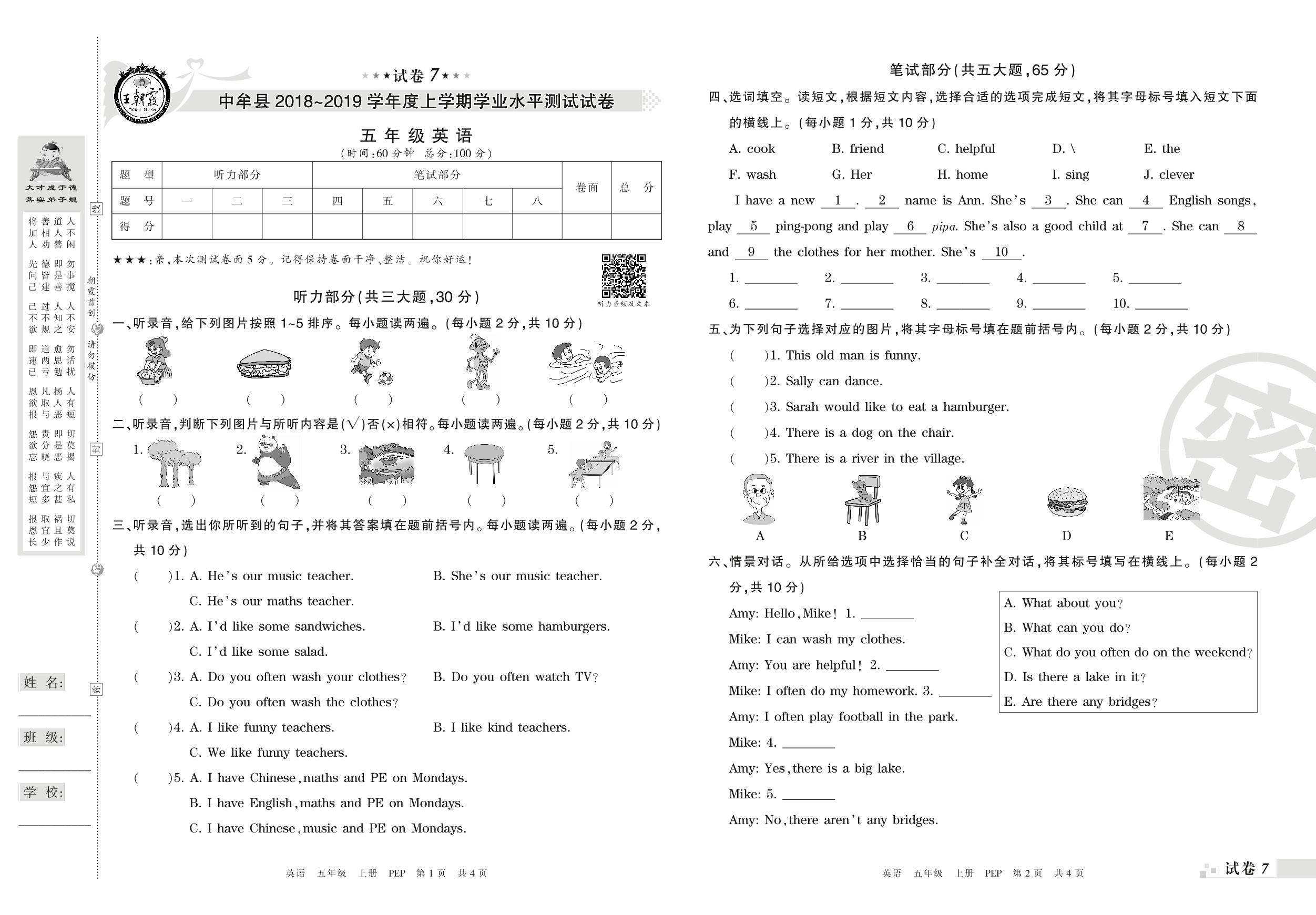 2018-2019学年第一学期郑州市中牟县五年级英语试卷(PEP版)【7】