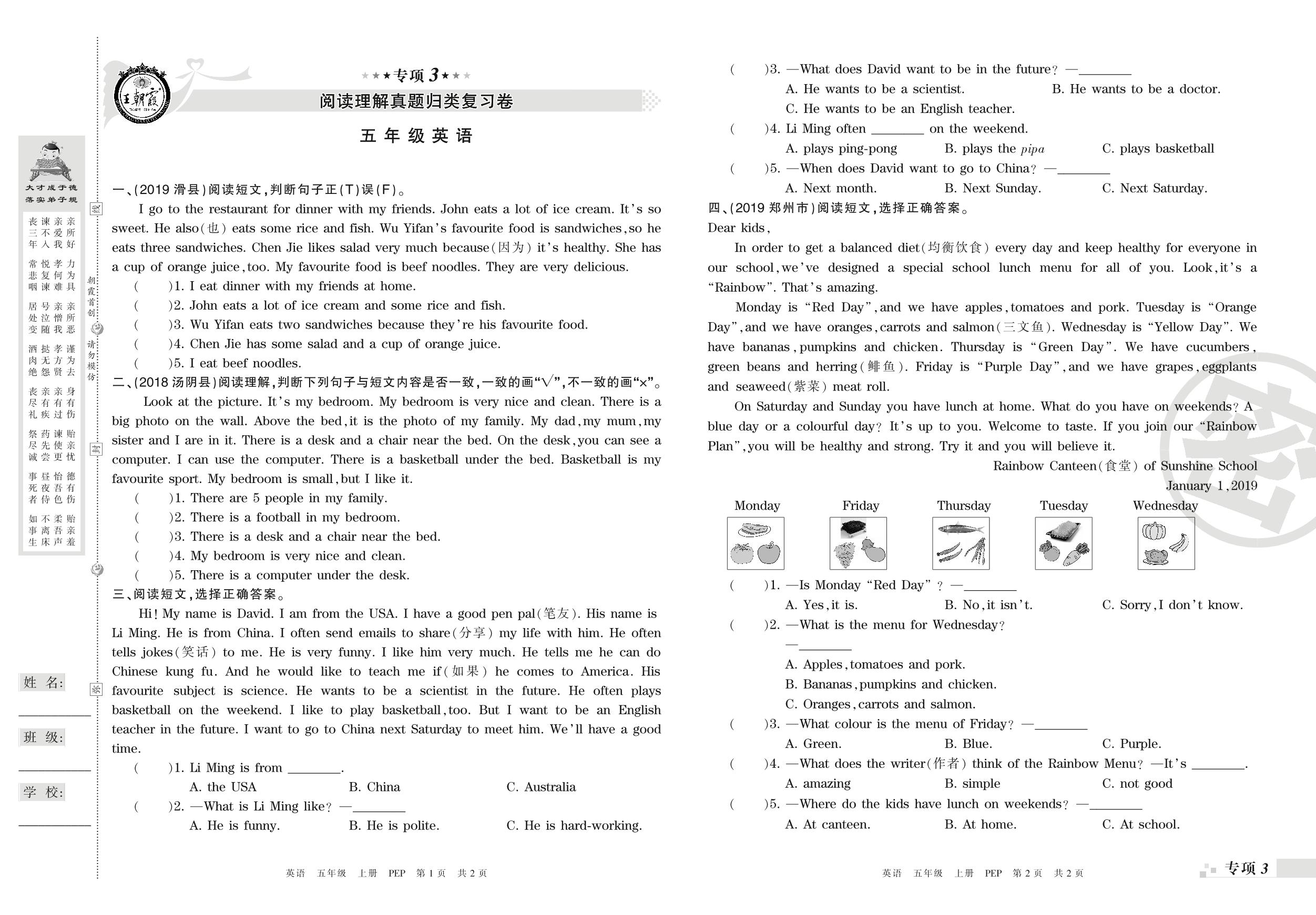 王朝霞期末专项卷——阅读理解、补全对话与书面表达真题归类复习五年级上册英语(PEP版)_R210807143743【0】