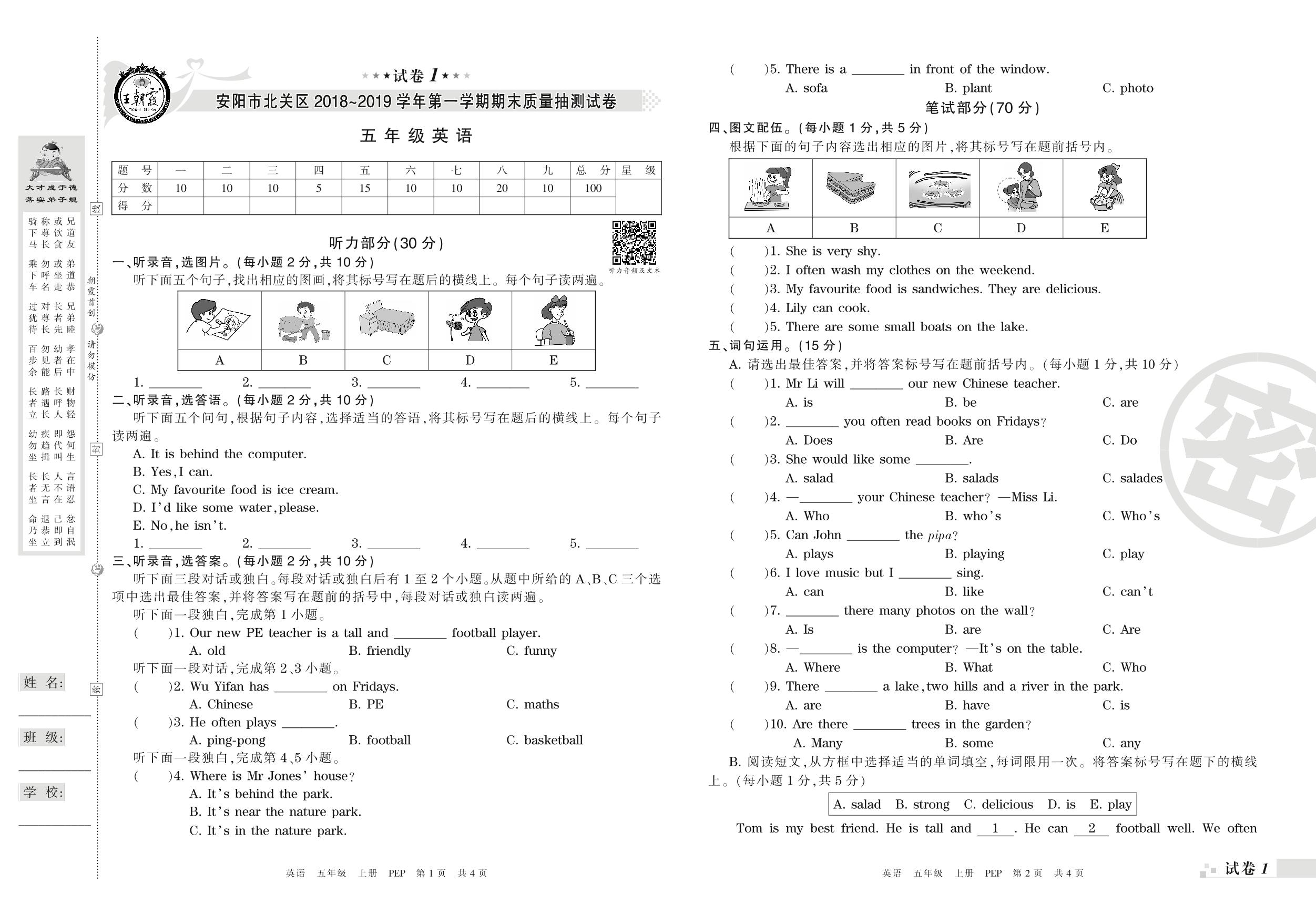 2018-2019学年第一学期安阳市北关区五年级英语试卷(PEP版)【1】