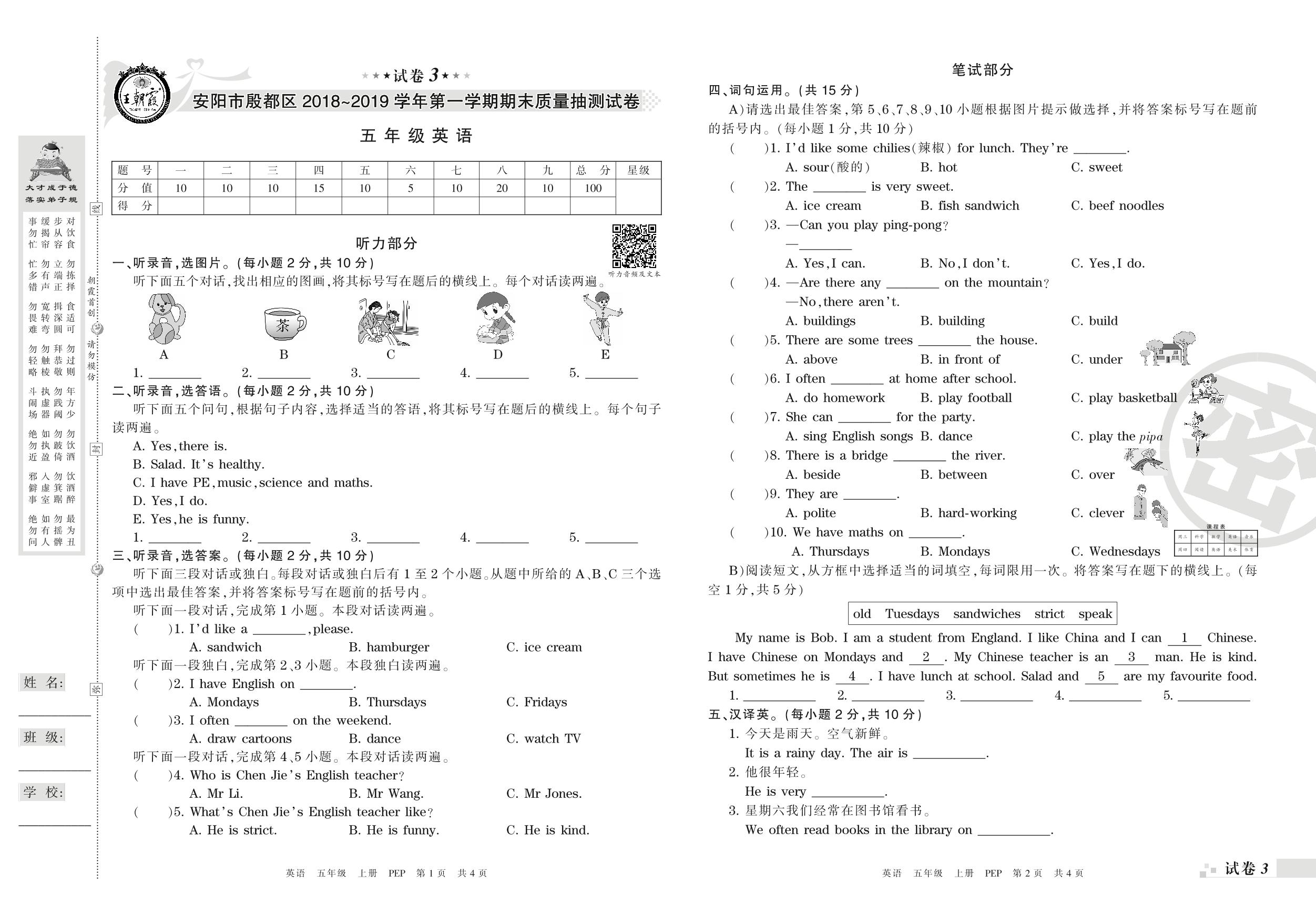 2018-2019学年第一学期安阳市殷都区五年级英语试卷(PEP版)【3】