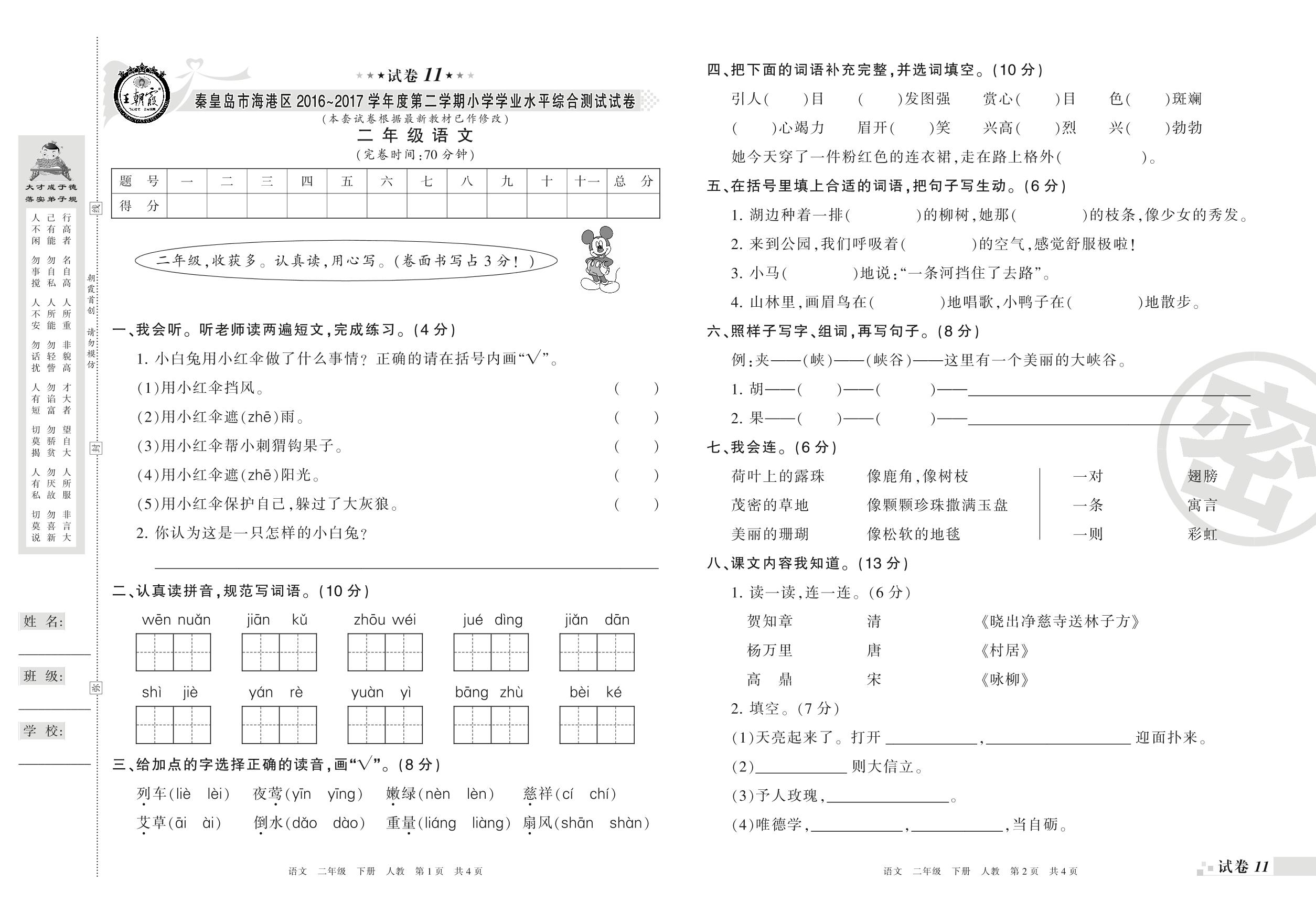 2016-2017学年第二学期秦皇岛市海港区二年级语文试卷(人教版)【11】