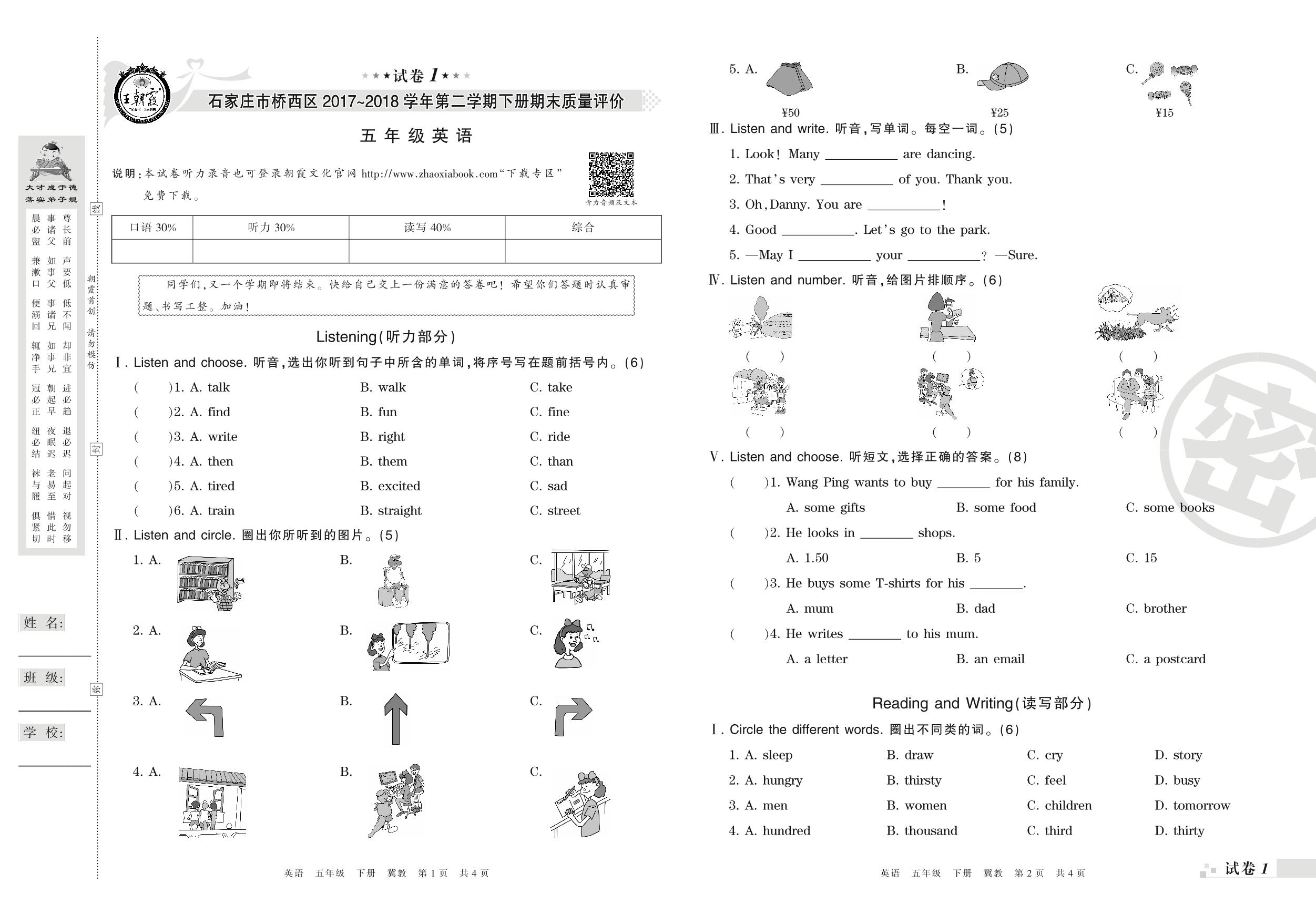 2017-2018学年第二学期石家庄市桥西区五年级英语试卷(冀教版)【1】