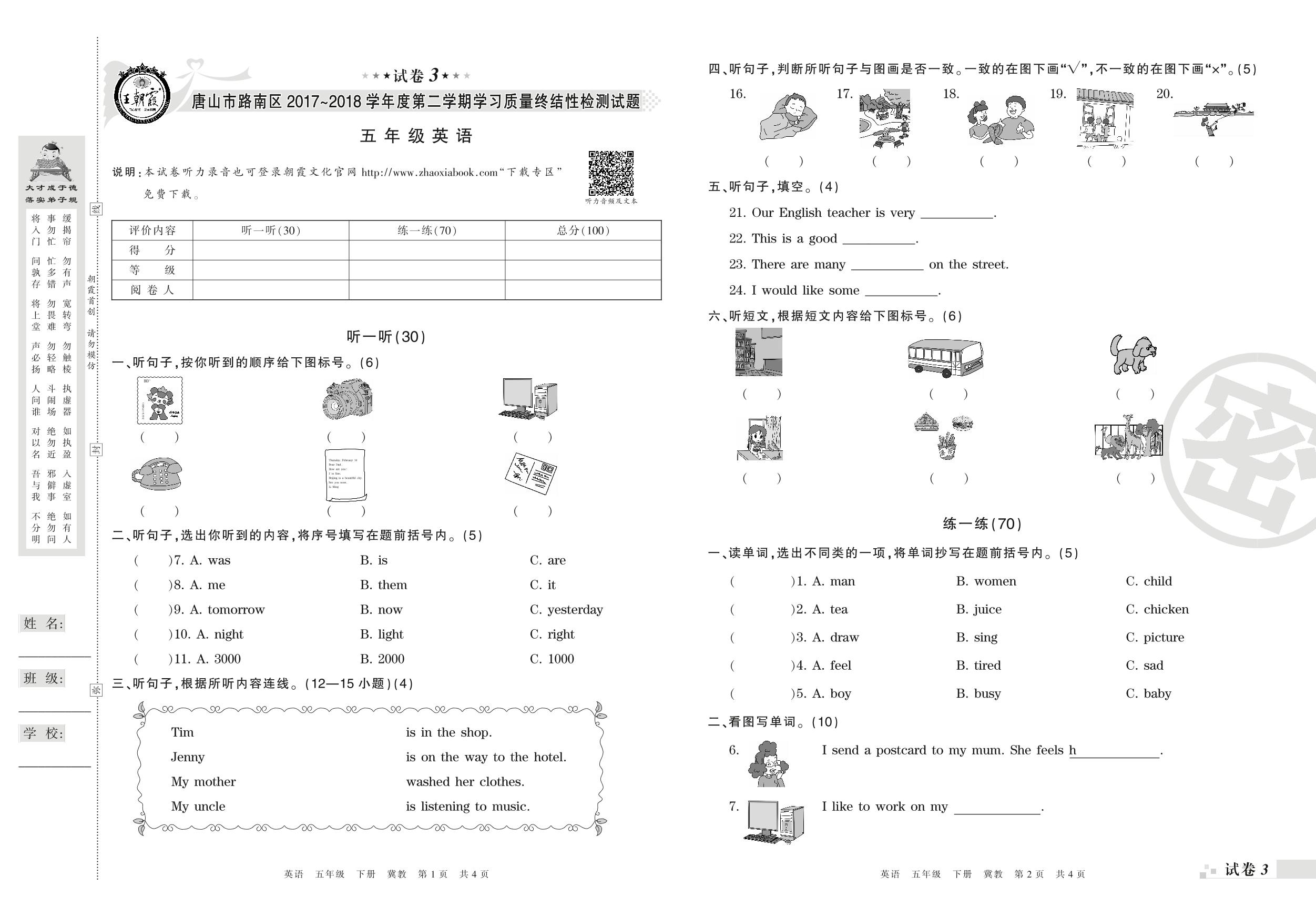 2017-2018学年第二学期唐山市路南区五年级英语试卷(冀教版)【3】